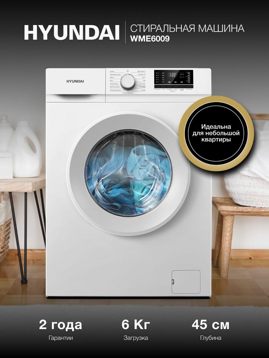 Стиральная машина HYUNDAI WME6009, глубина 45 см, загрузка 6 кг, с функцией Пар, 16 программ , отсрочка старта, белый интересное:
