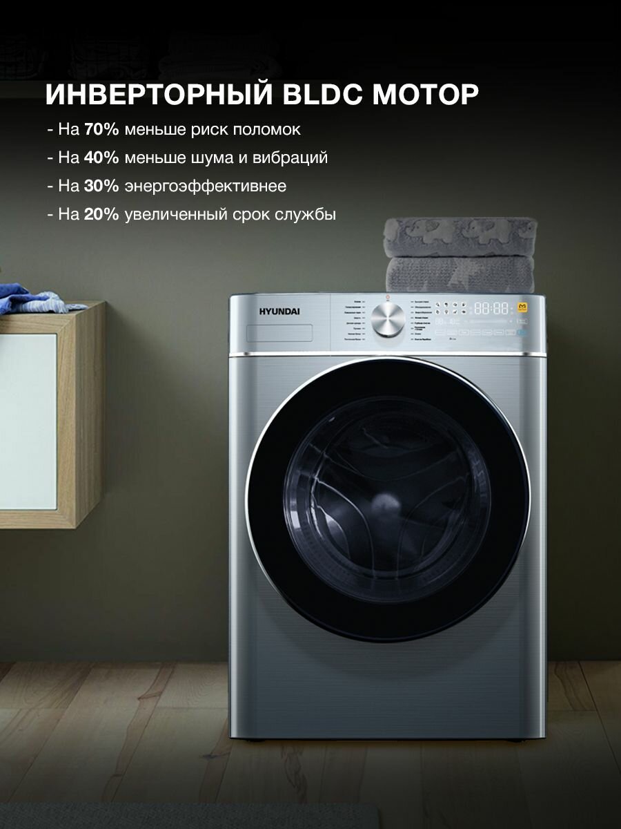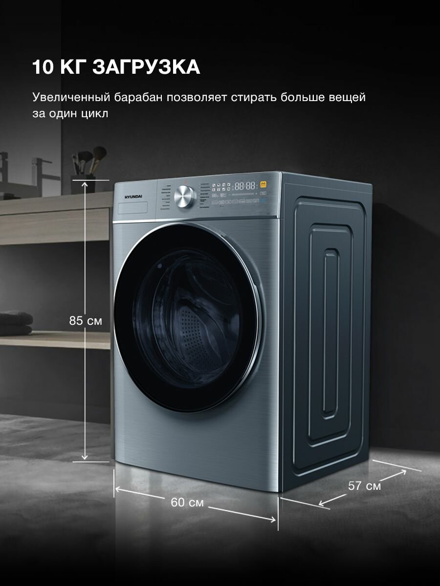 Стиральная машина Hyundai WFE9230, глубина 60 см, загрузка 10 кг, с функцией Пар, инверторный двигатель, электронное управление, отсрочка старта, серый цвет. Устанавливается в колонну с DFE9430