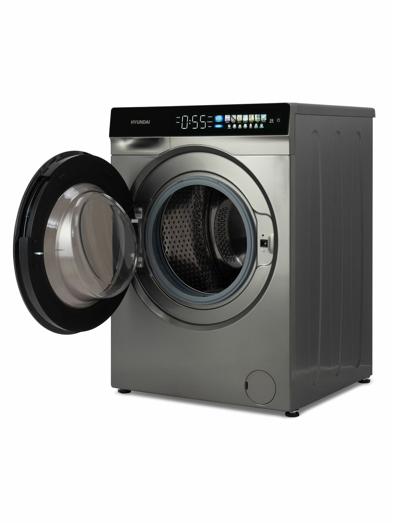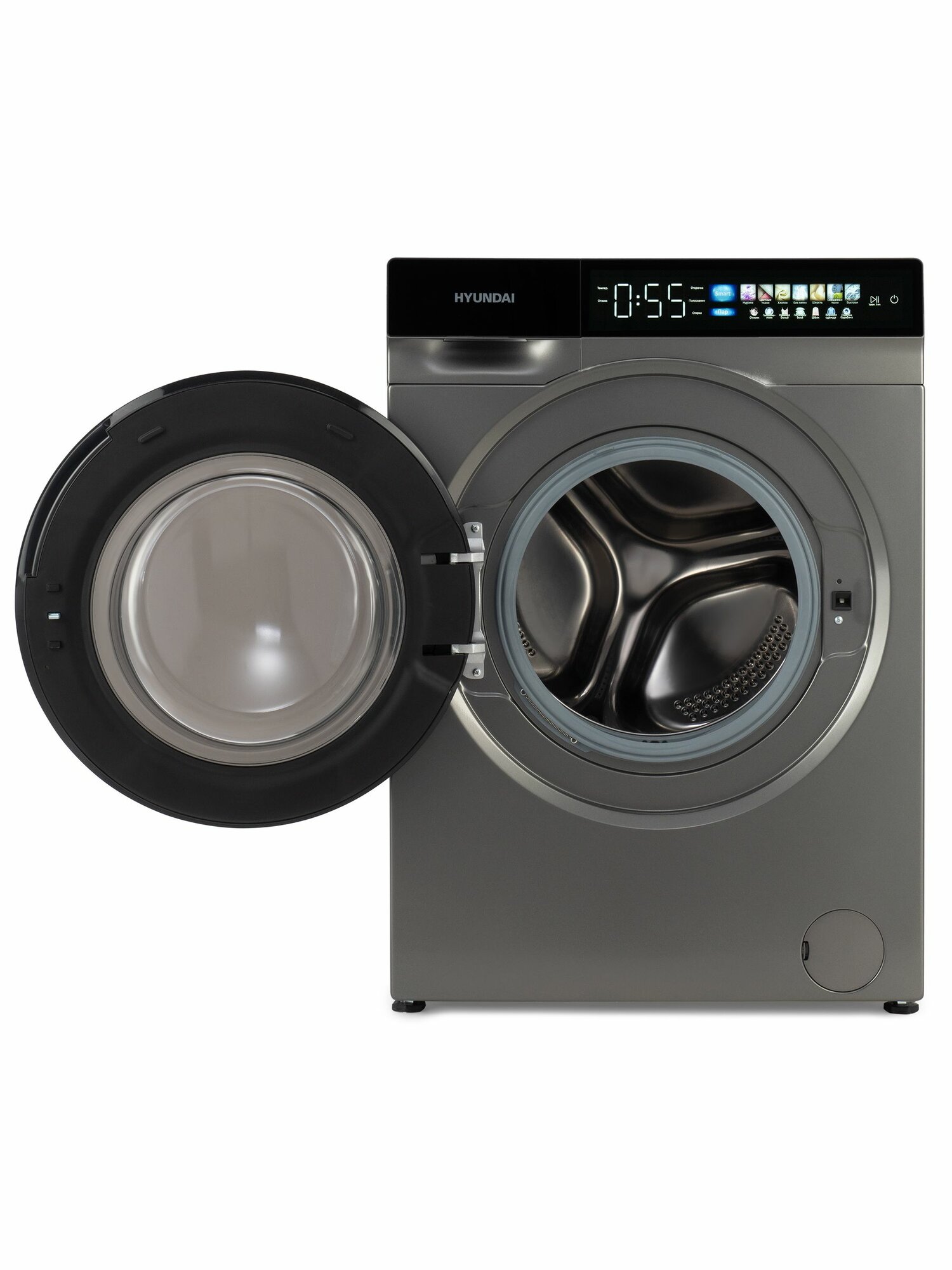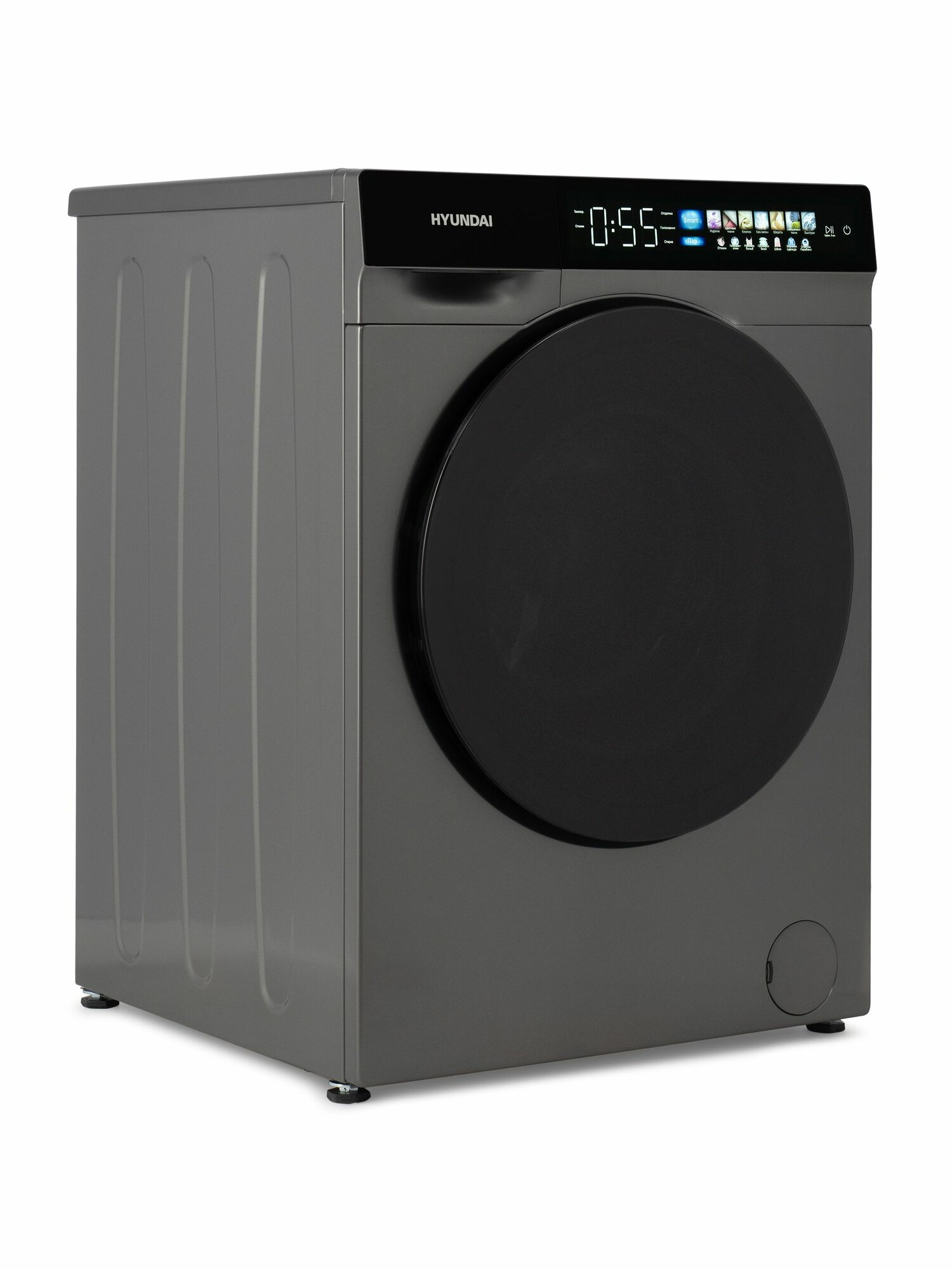 Стиральная машина Hyundai WME9413, с инвертором и паром, 57 см, загрузка 10 кг, сенсерный дисплей, автовзвешивание, отсрочка старта, цвет серый