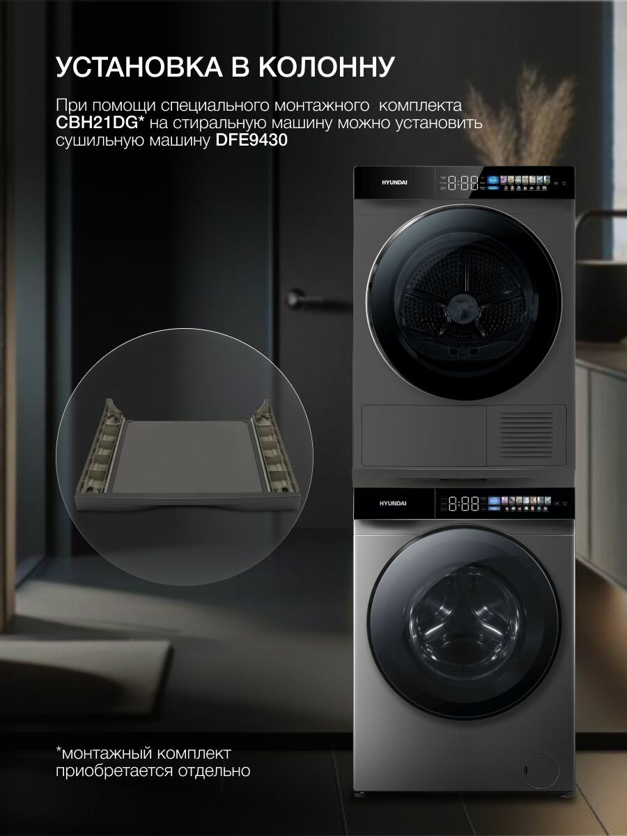Стиральная машина Hyundai WFE9229, глубина 60 см, загрузка 10 кг, с паром и сенсорным дисплеем, отсрочка старта, белый, установка в колонну с DFE9429
