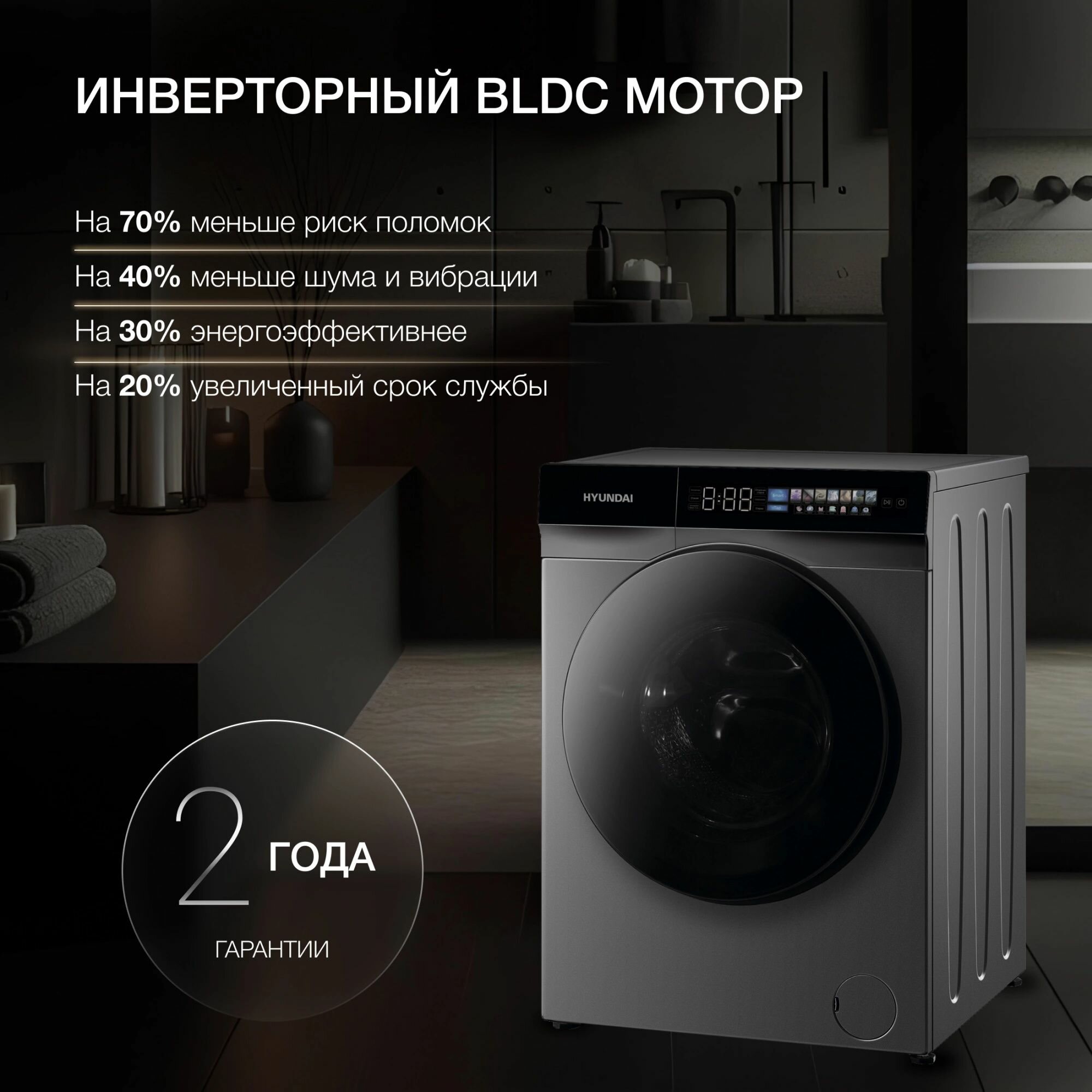 Купить Стиральная машина Hyundai WFE9230, глубина 60 см, загрузка 10 кг, с функцией Пар, инверторный двигатель, электронное управление, отсрочка старта, серый цвет. Устанавливается в колонну с DFE9430