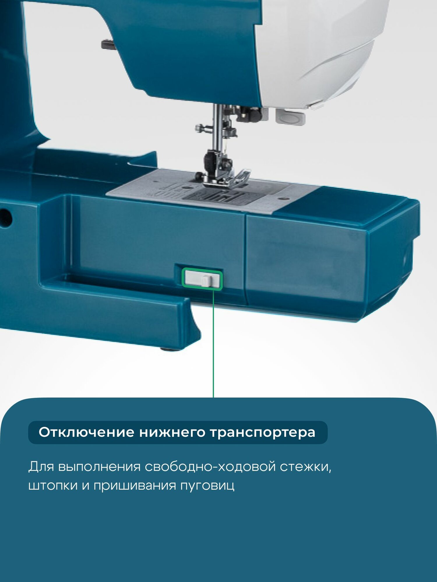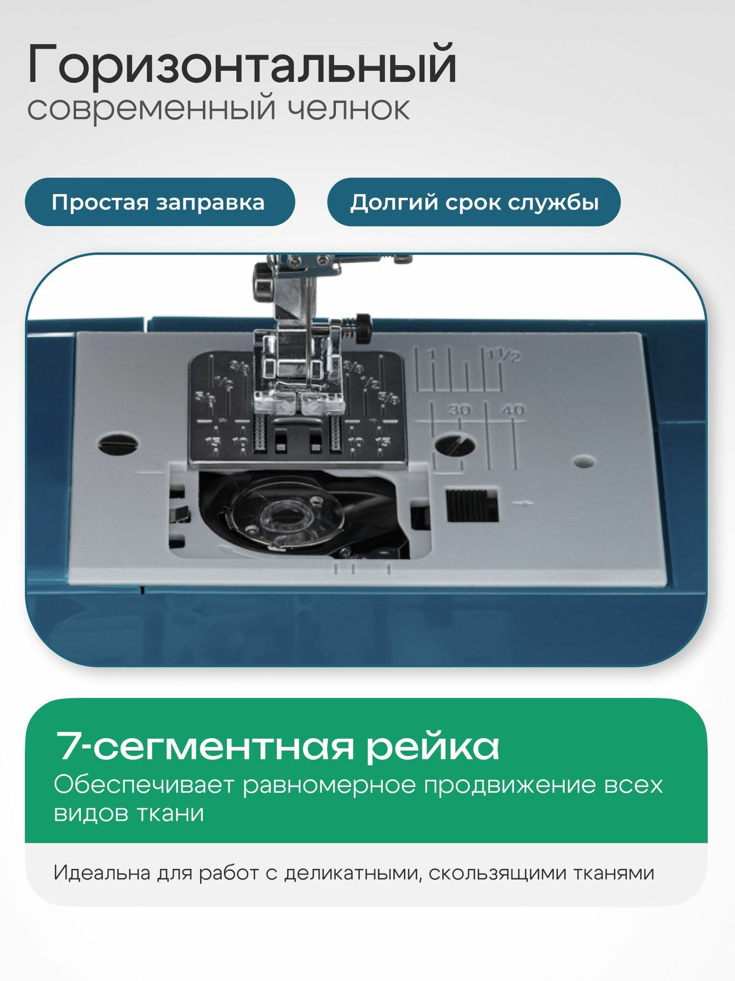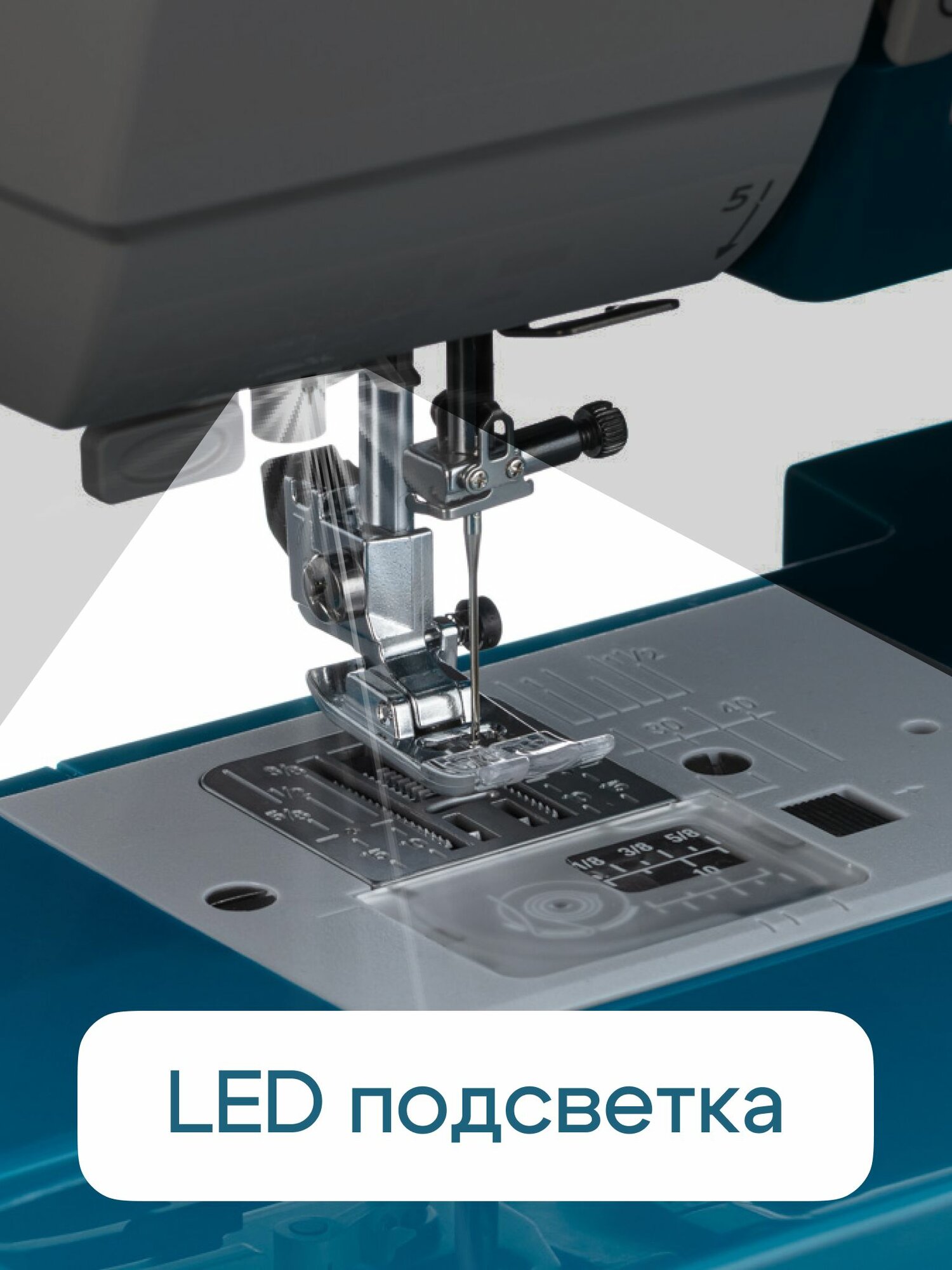 | Функциональные особенности швейного оборудования | Дисплей, Подсветка рабочей зоны, Реверс, Регулировка скорости шитья |