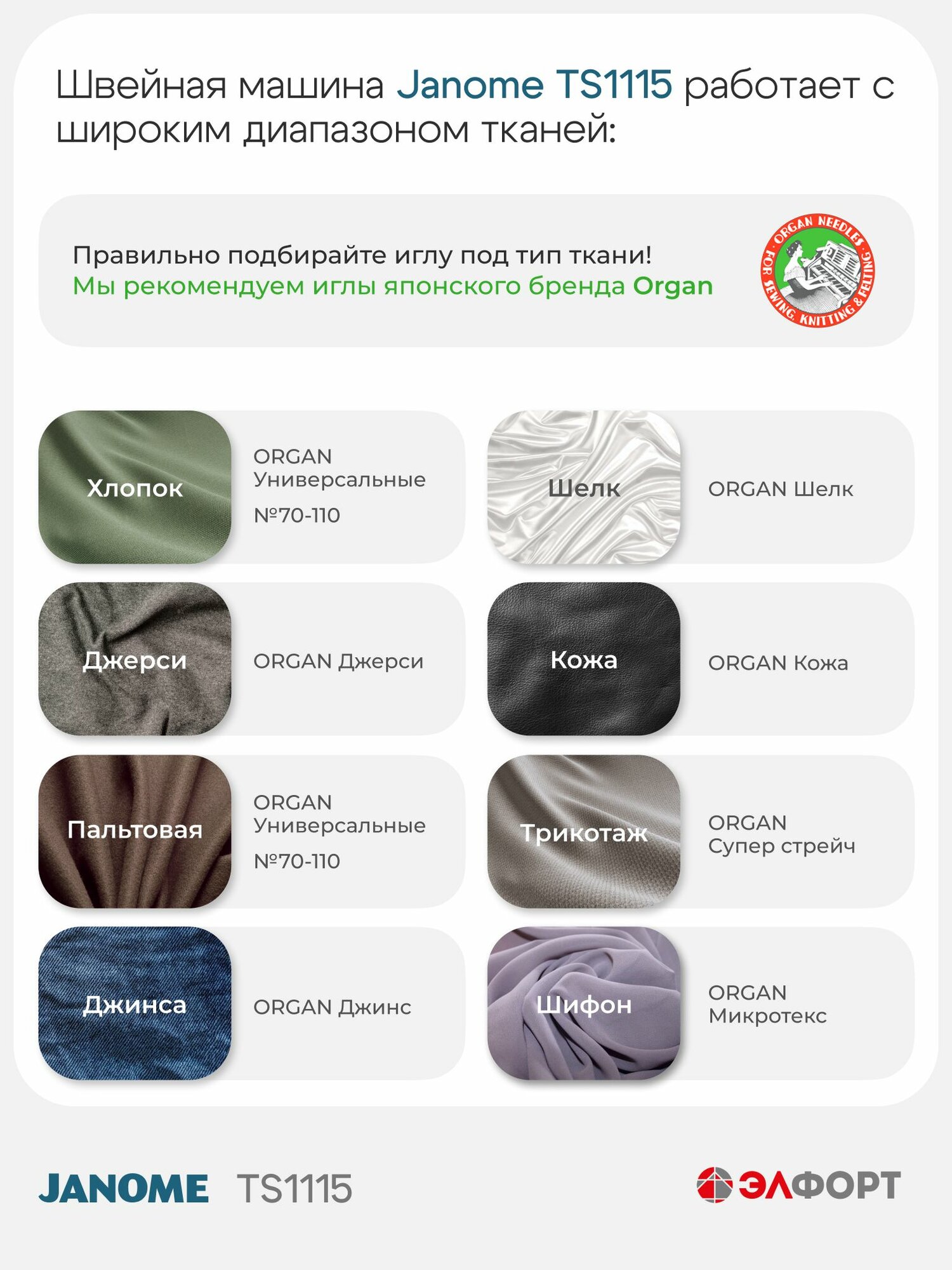 | Прошиваемые ткани | Для всех типов тканей |