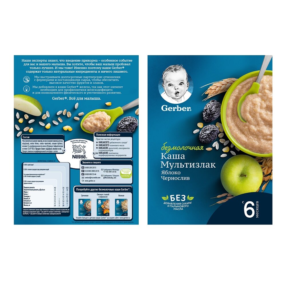 Каша Gerber Мультизлак яблоко и чернослив безмолочная с 6 месяцев, 180г
