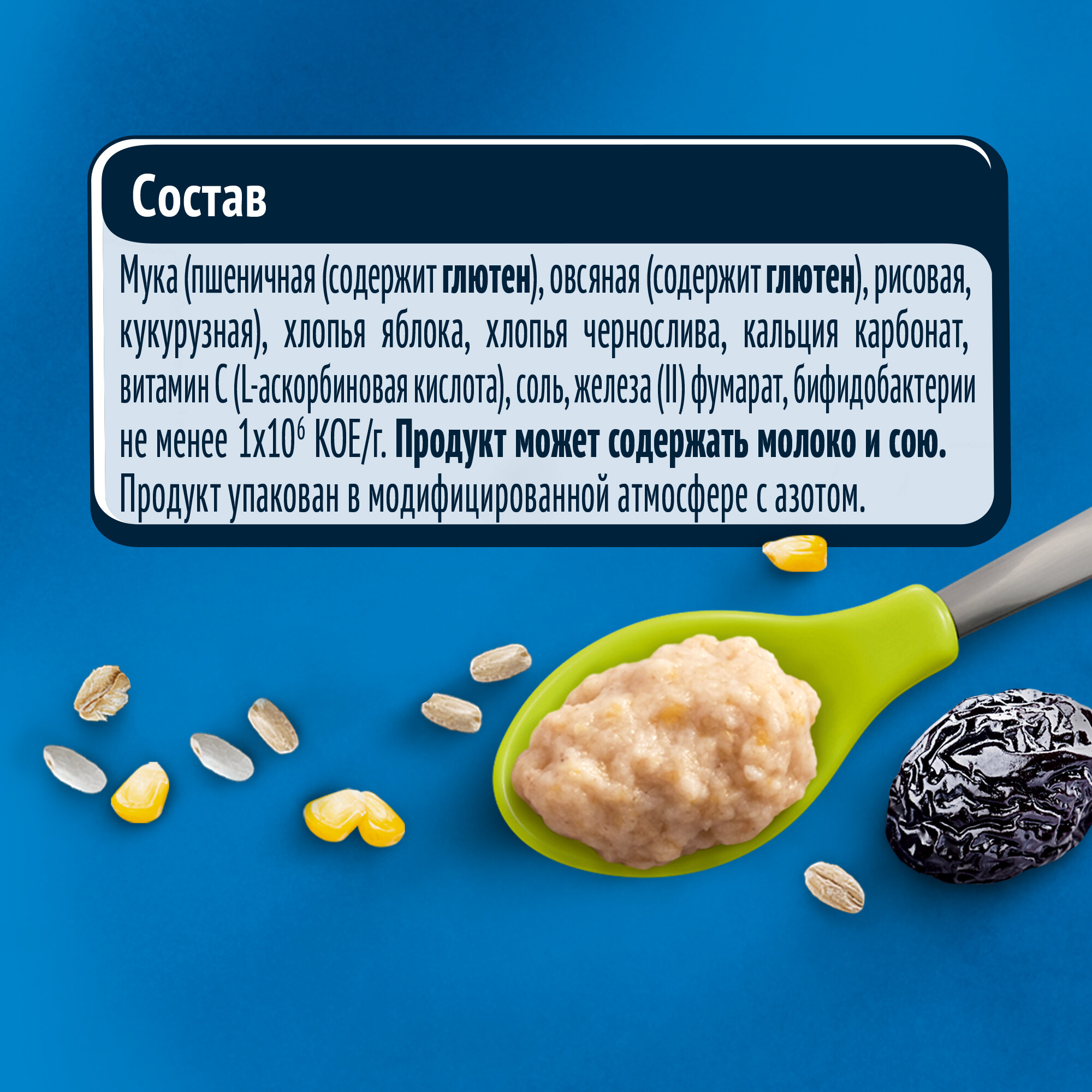 | Состав | мука (пшеничная (80,7%) (содержит глютен), гречневая (4,2%), рисовая (4,2%), кукурузная (2,8%), овсяная (2,8%) (содержит глютен)), хлопья яблока (2%), хлопья чернослива (2%), минеральные вещества (кальция карбонат, железа(II) фумарат), бифидобактерии не менее 1х10^6 КОЕ/г. Продукт может содержать молоко. Продукт упакован в модифицированной атмосфере с азотом. |