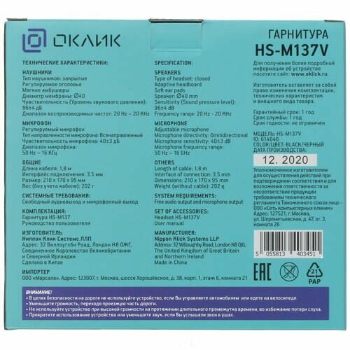Гарнитура проводная Oklick HS-M137V регулятор громкости