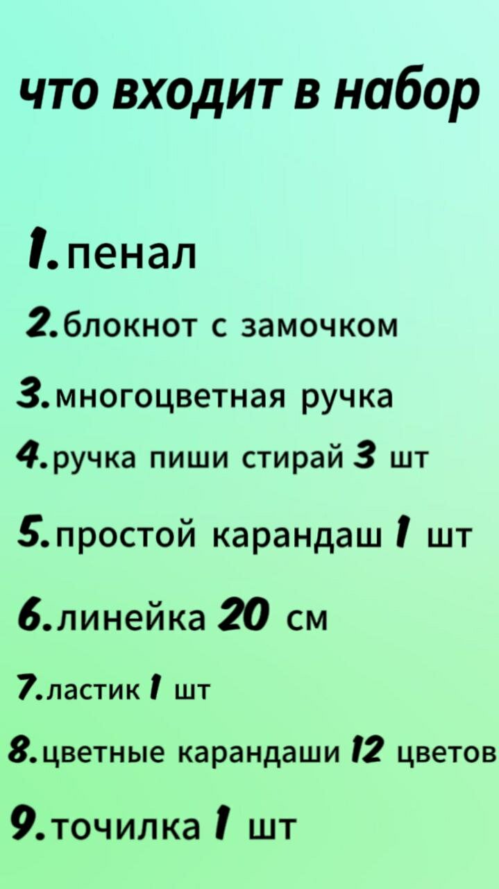 | В наборе | блокнот / карандаш / ластик / линейка / пенал / ручка / точилка |