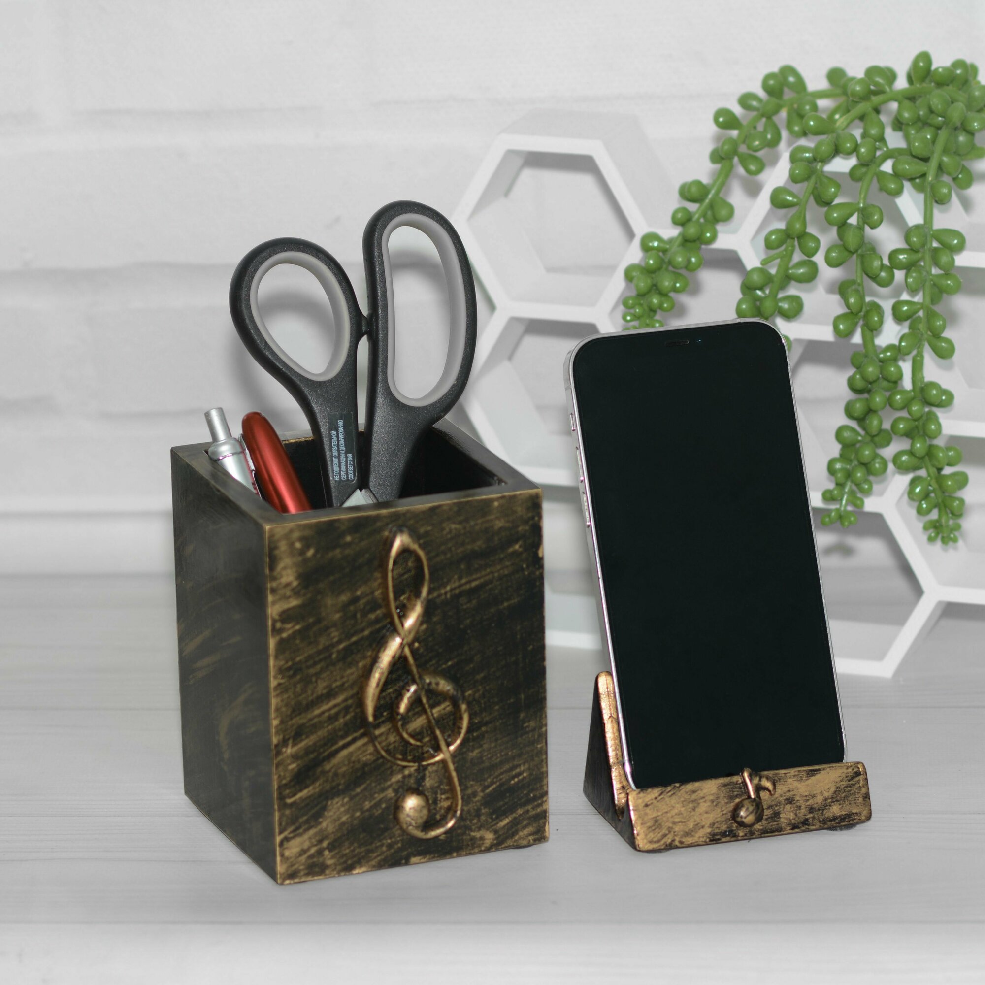СохранитьПодарок музыканту: Подставка для ручек Скрипичный ключ и держатель для телефона // Цвет черное золото интересное: