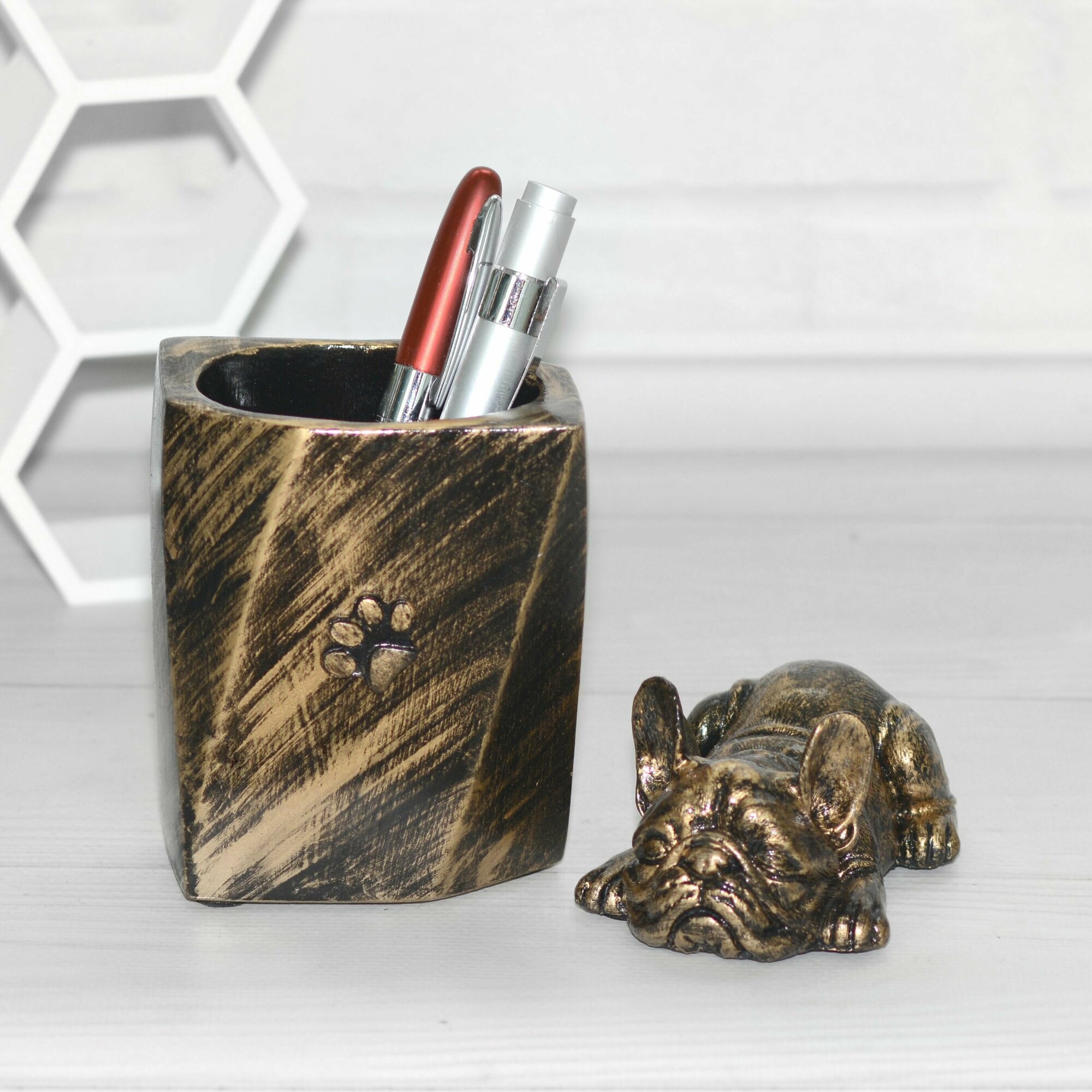 Подарочный набор: Подставка для ручек и фигурка бульдога