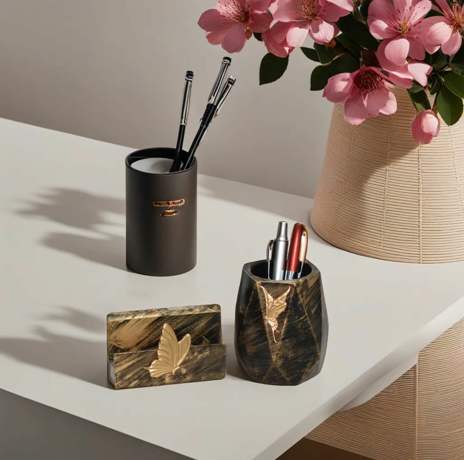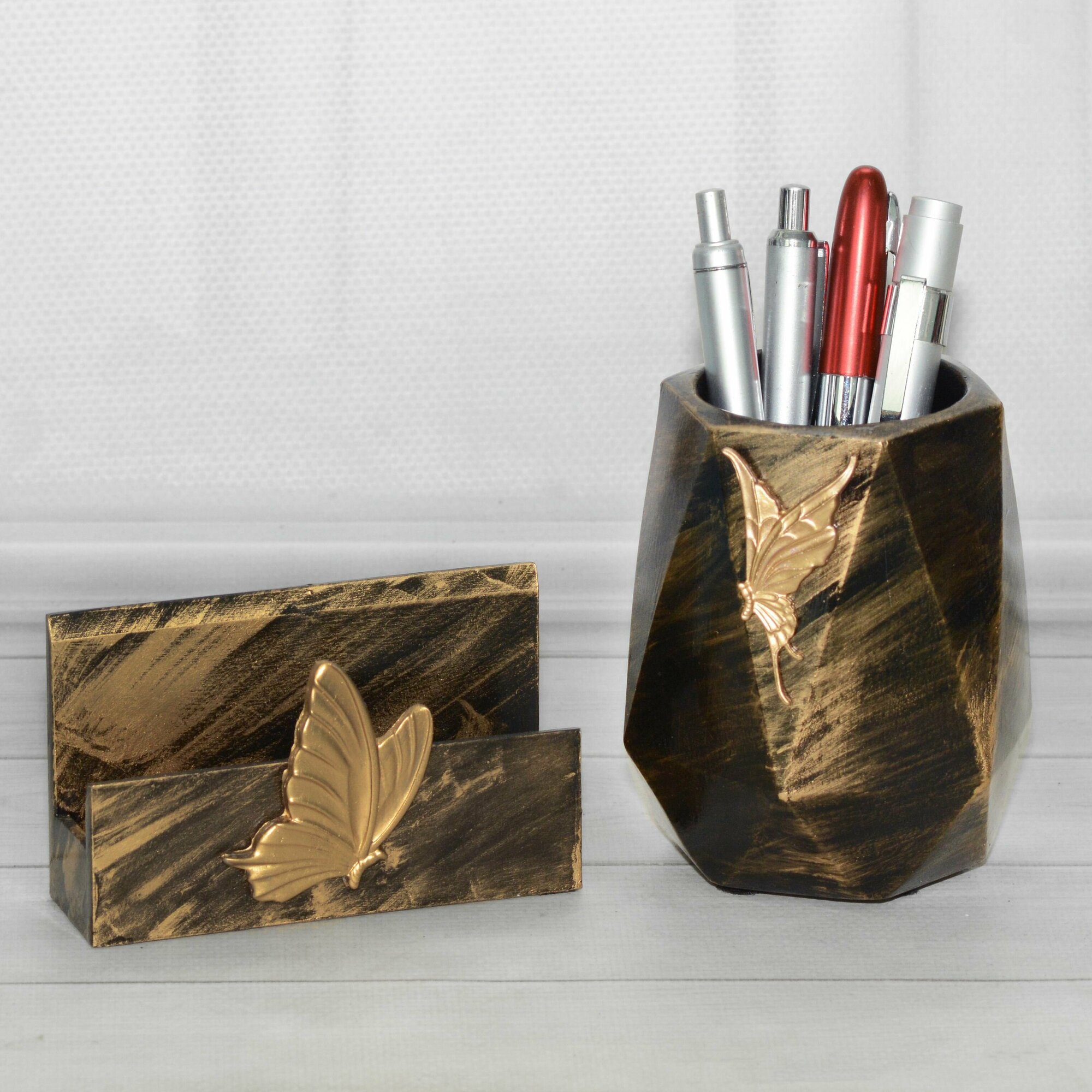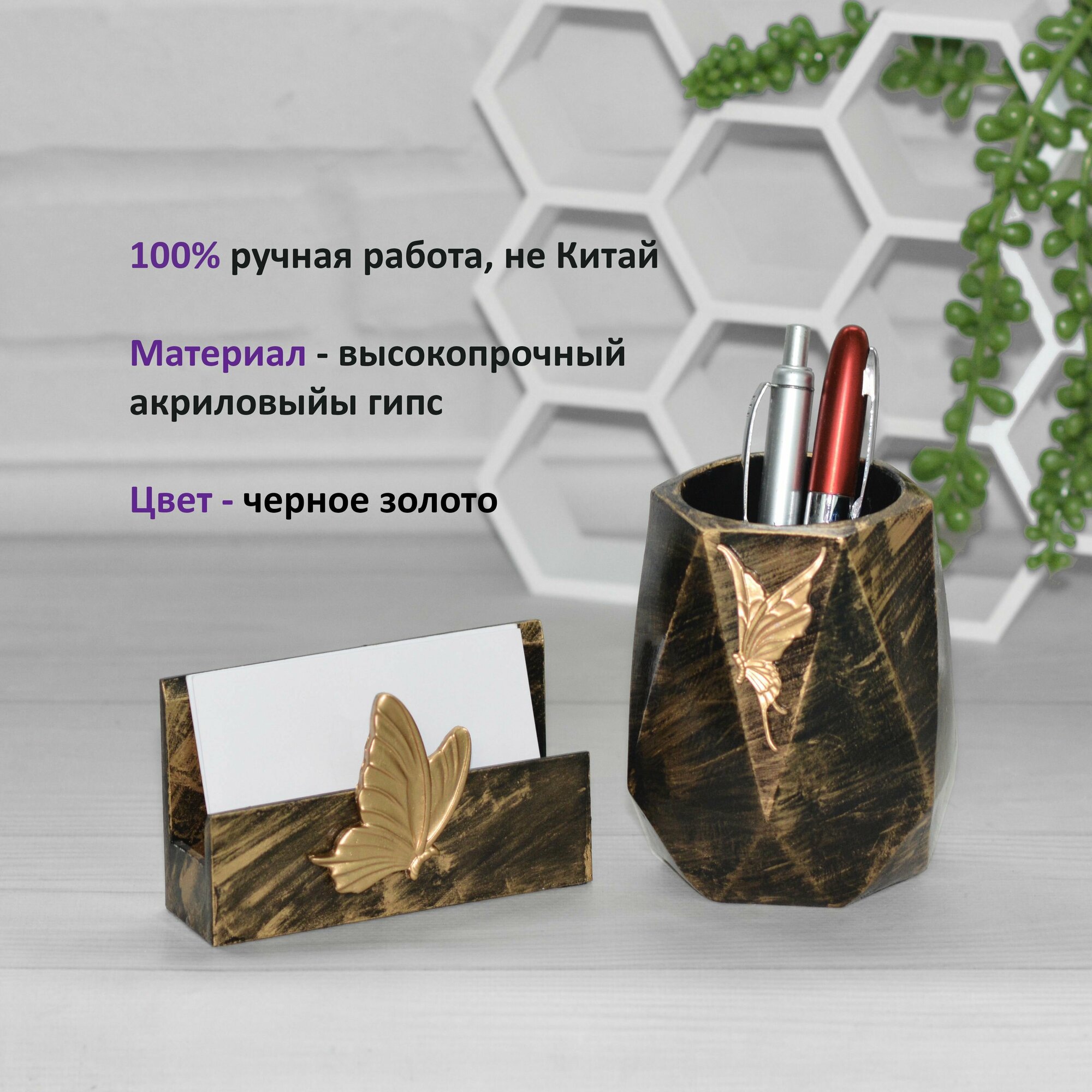 СохранитьОрганайзер для канцелярии Бабочки: Подставка для ручек и визитница // Цвет Черное золото интересное: