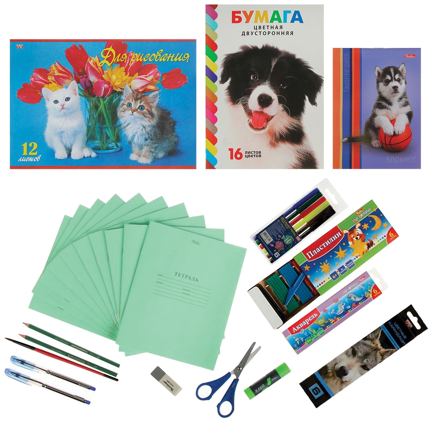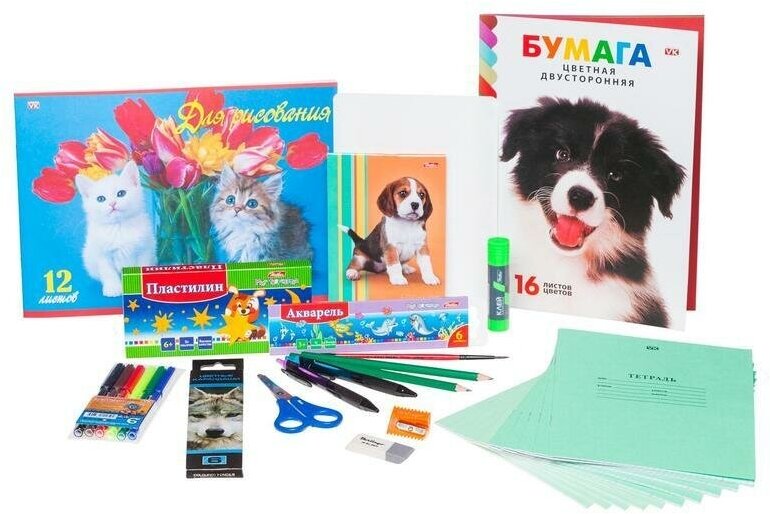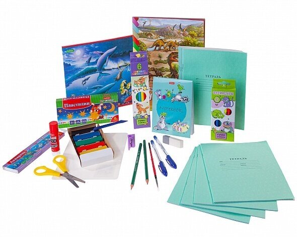 | В комплекте | доска для лепки - 1 шт., клей-карандаш - 1 шт., ручка шариковая синяя - 2 шт., карандаш чернографитный - 2 шт., точилка - 1 шт., пластилин - 1 шт., набор цветных карандашей - 1 шт., набор фломастеров - 1 шт., ножницы - 1 шт., ластик - 1 шт., краски акварельные без кисти - 1 шт., альбом для рисования - 1 шт., тетради в клетку - 5 шт., тетради в косую линию - 5 шт., набор цветной бумаги - 1 шт., блокнот для записей - 1 шт., кисть - 1 шт. |
