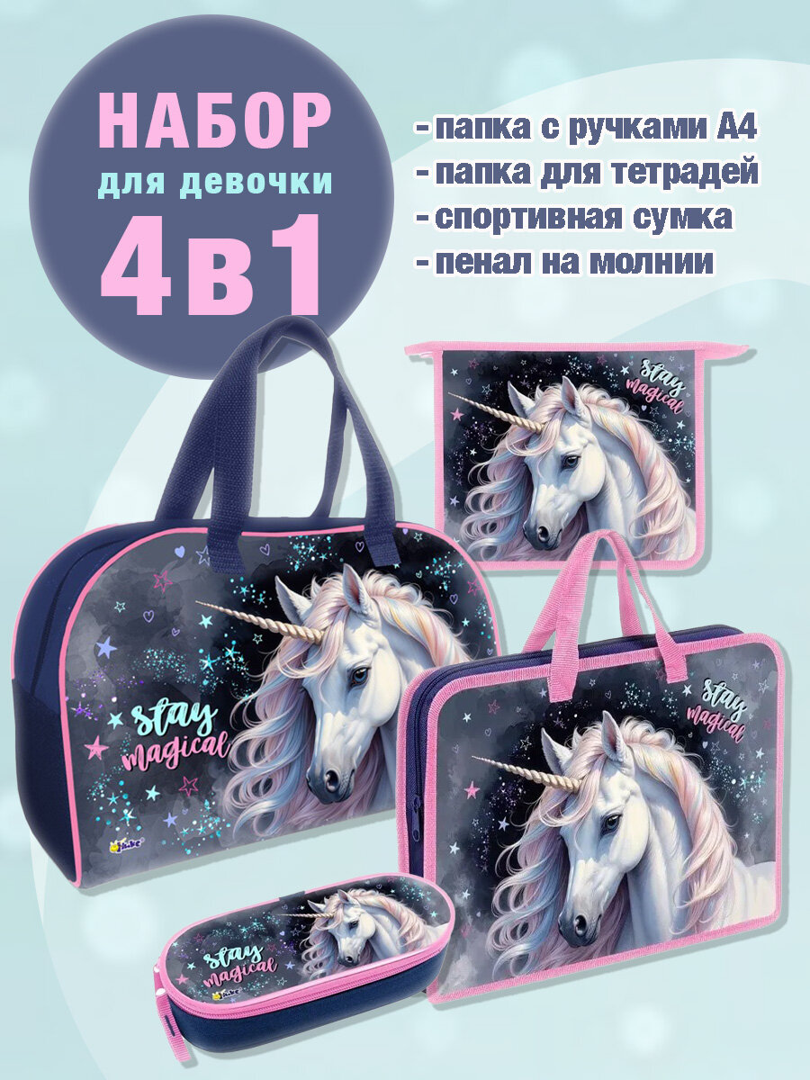 Купить Школьный набор "звездный единорог" (папка с ручками А4, папка А5, пенал, спортивная сумка)
