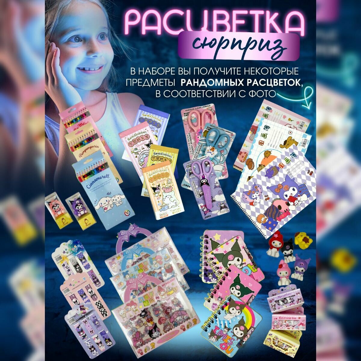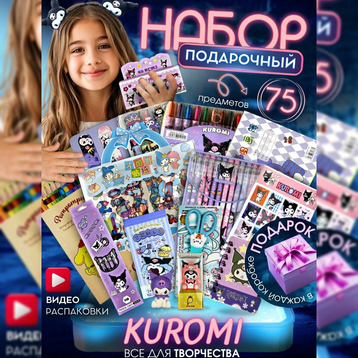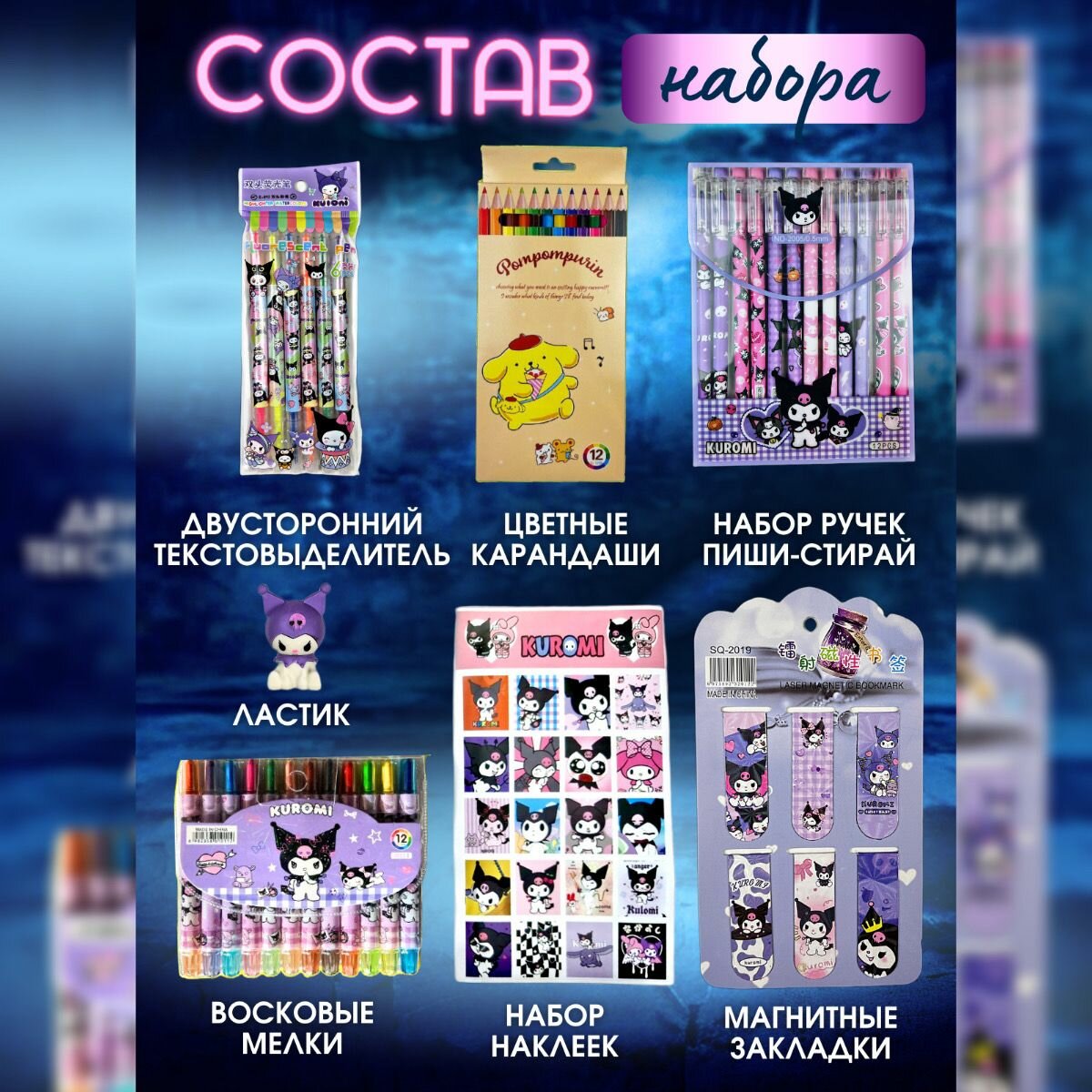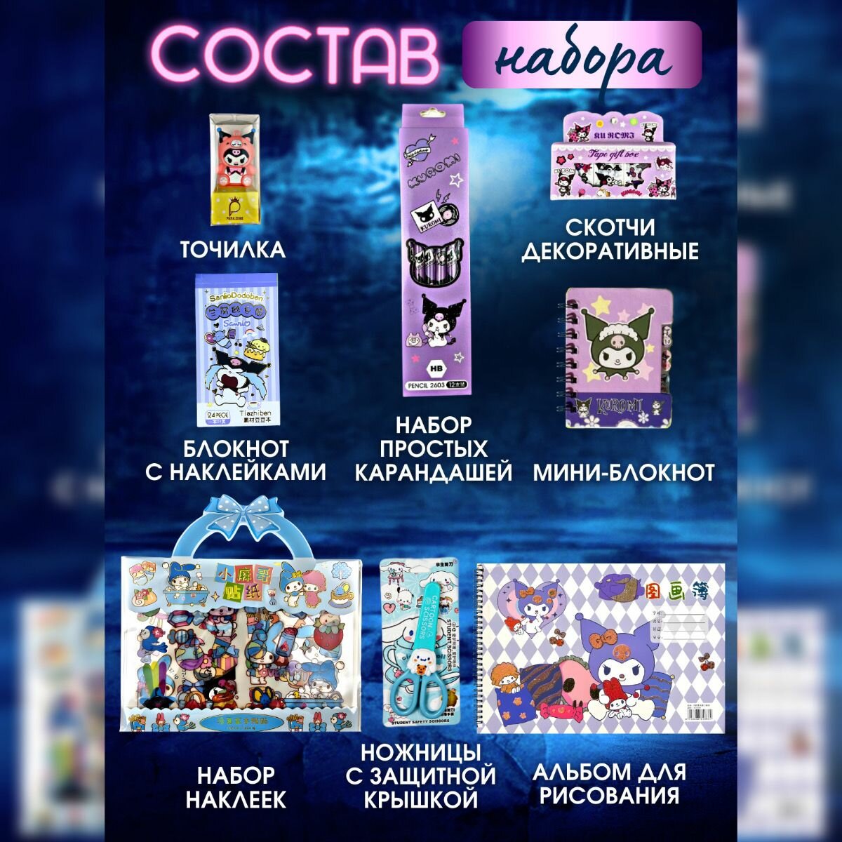 | В комплекте | 1. Ручки (Пиши-стирай) - 12 шт; 2. Текстовыделитель двухсторонный - 6 шт; 3. Мини-Блокнот; 4. Ластик - 1 шт; 5. Ножницы с защитным чехлом - 1 шт; 6. Блокнот с наклейками; 7. Закладки магнитные - 6 шт; 8. Скотч цветной с героями Куроми; 9. Точилка 10. Альбом для рисования; 11. Карандаши цветные 12 шт; 12. Карандаши обычные 12 шт; 13. Набор наклеек сумочка; 14. Набор наклеек; 15. Восковые мелки; Подарочная коробка с бантом. В наборе цвета могут отличатся, все кладется рандомно! |