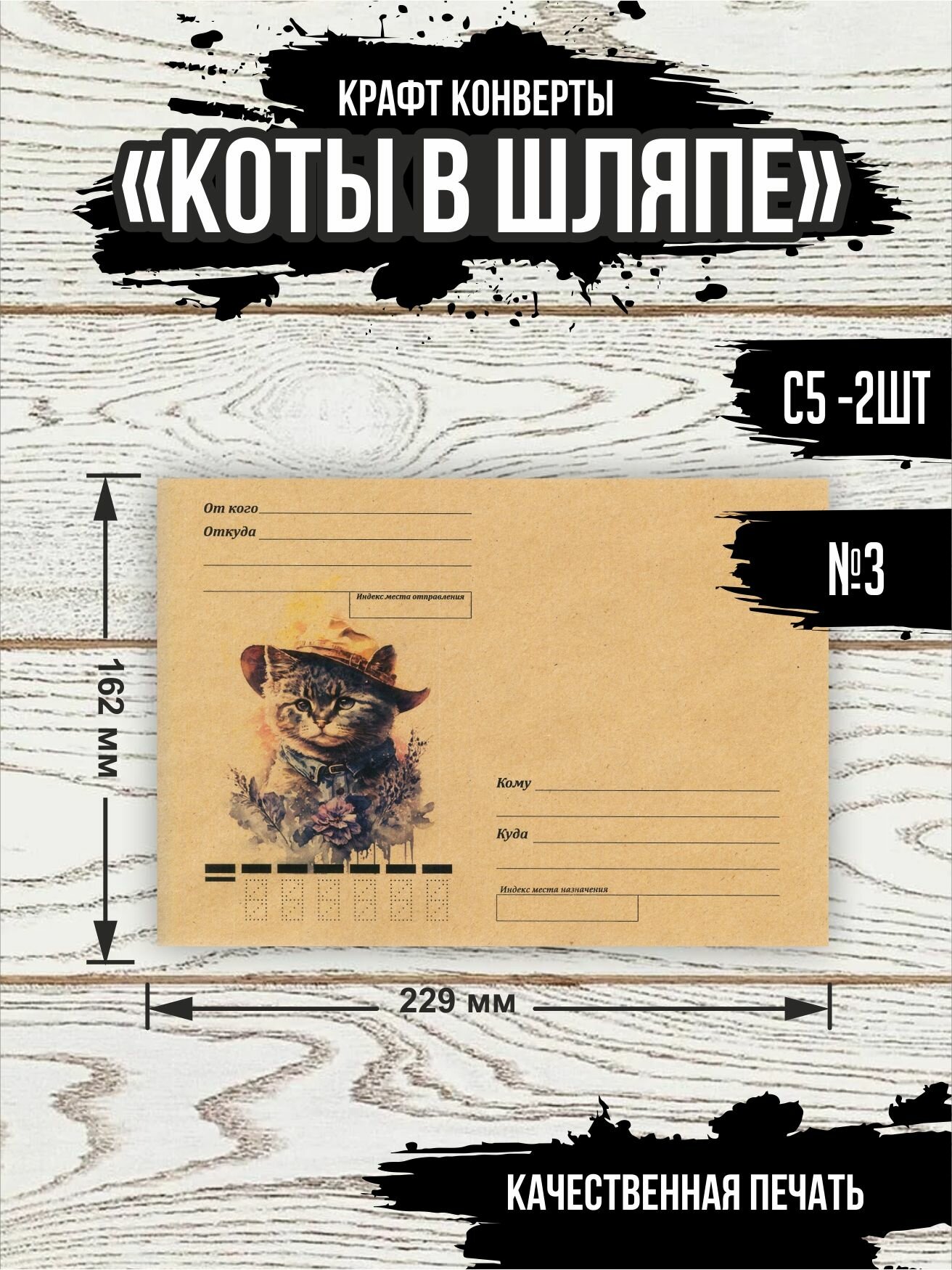Почтовые крафт конверты "Коты в шляпе" 20 шт. С5 интересное:
