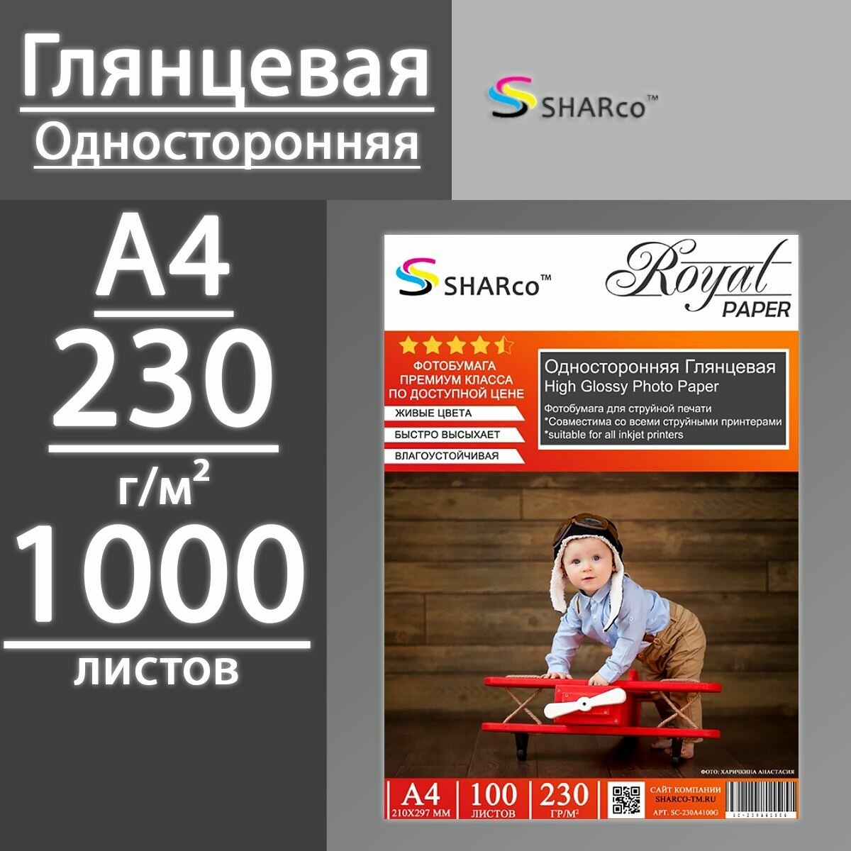 Фотобумага SHARco глянцевая односторонняя 230 г, А4, 1000 листов (10 пачек по 100 л) интересное: