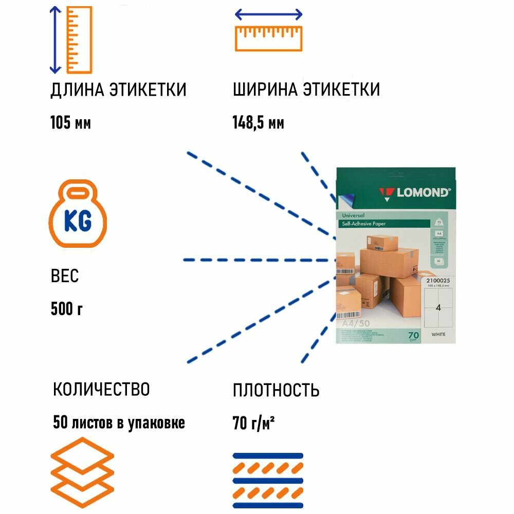 | Тип бумаги | 105х148.5 мм / 4 этикетки / 50 л / А4 / Самоклеящаяся бумага LOMOND белая |
