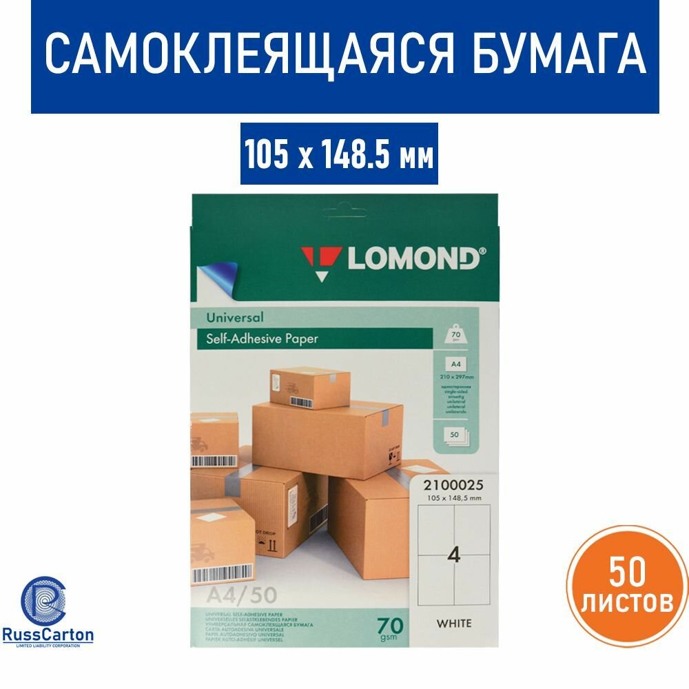 Купить Самоклеящаяся бумага LOMOND белая, А4, 50 л, 4 этикетки, 105х148.5 мм