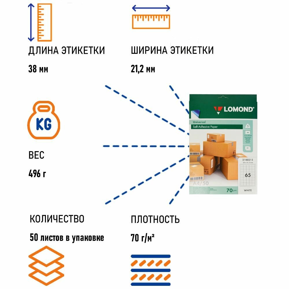 | Тип бумаги | 38х21.2 мм / 50л / 65 этикеток / А4 / Самоклеящаяся бумага LOMOND белая |