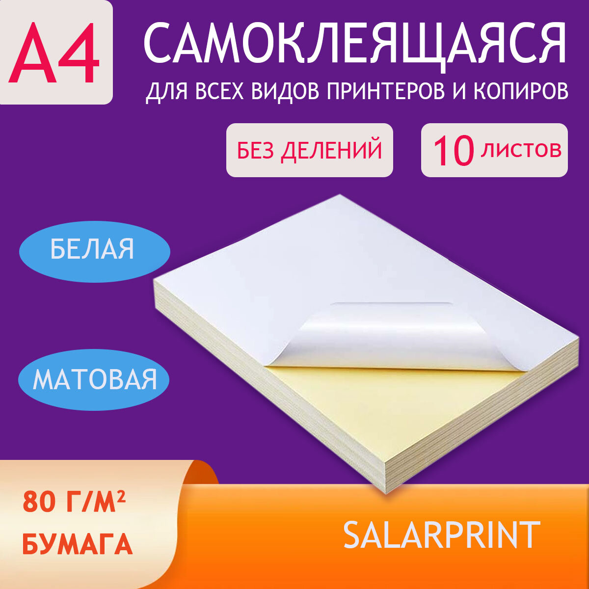 Купить Бумага самоклеящаяся, SalarPrint, белая матовая, А4, для печати на принтере наклеек, этикеток, штрих-кодов, 10 листов
