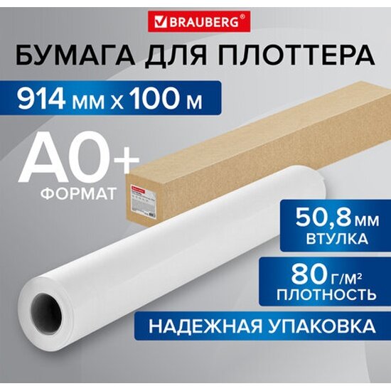 Купить Бумага широкоформатная Brauberg рулон для плоттера 914мм*100м*втулка 50,8мм, 80г/м2, CIE 146% 115354