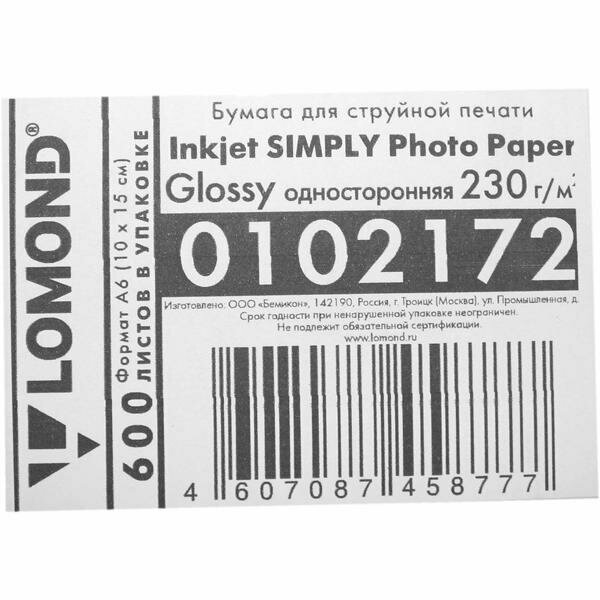 Купить Фотобумага Lomond Simply 10 x 15 см, 230 г/м2 (600 листов) экономичная глянцевая односторонняя (0102172)
