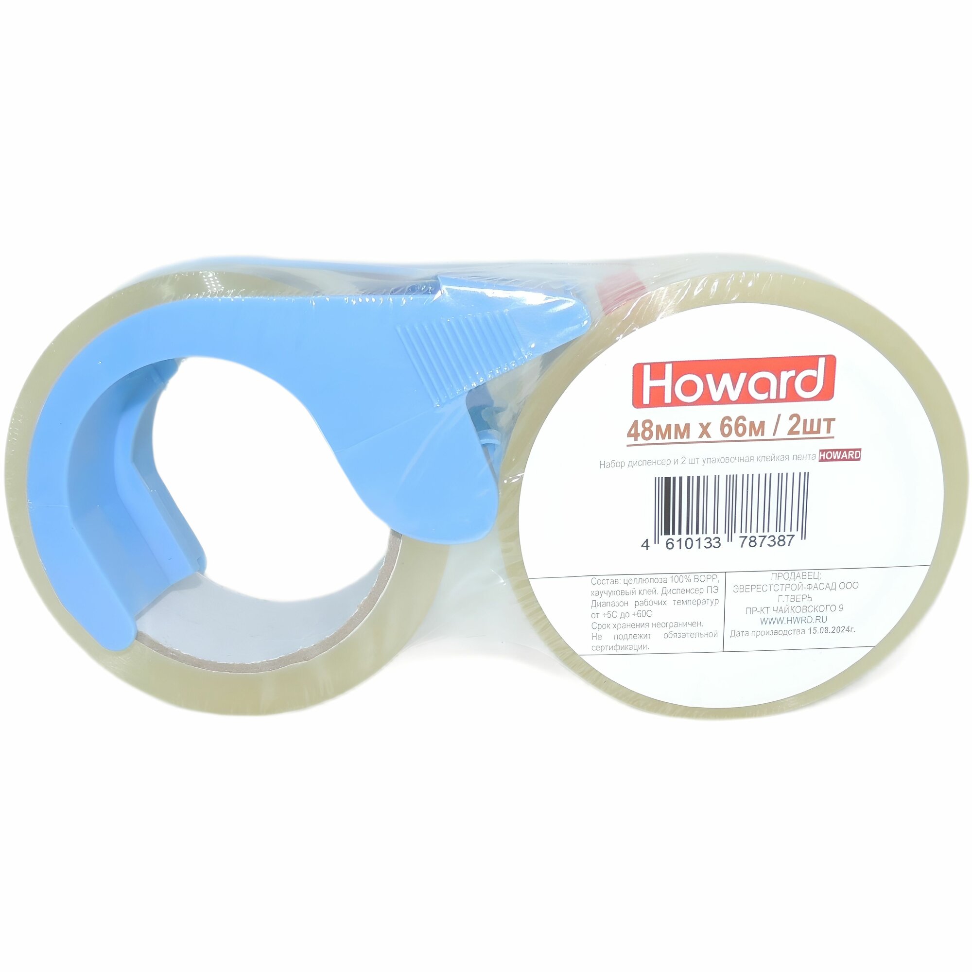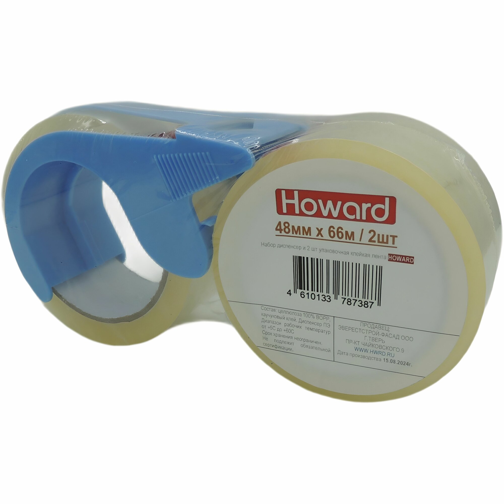 Клейкая упаковочная лента прозрачная HOWARD 48мм х 66м, 50мкм 2шт + Диспенсер с металлическим ножом1шт интересное: