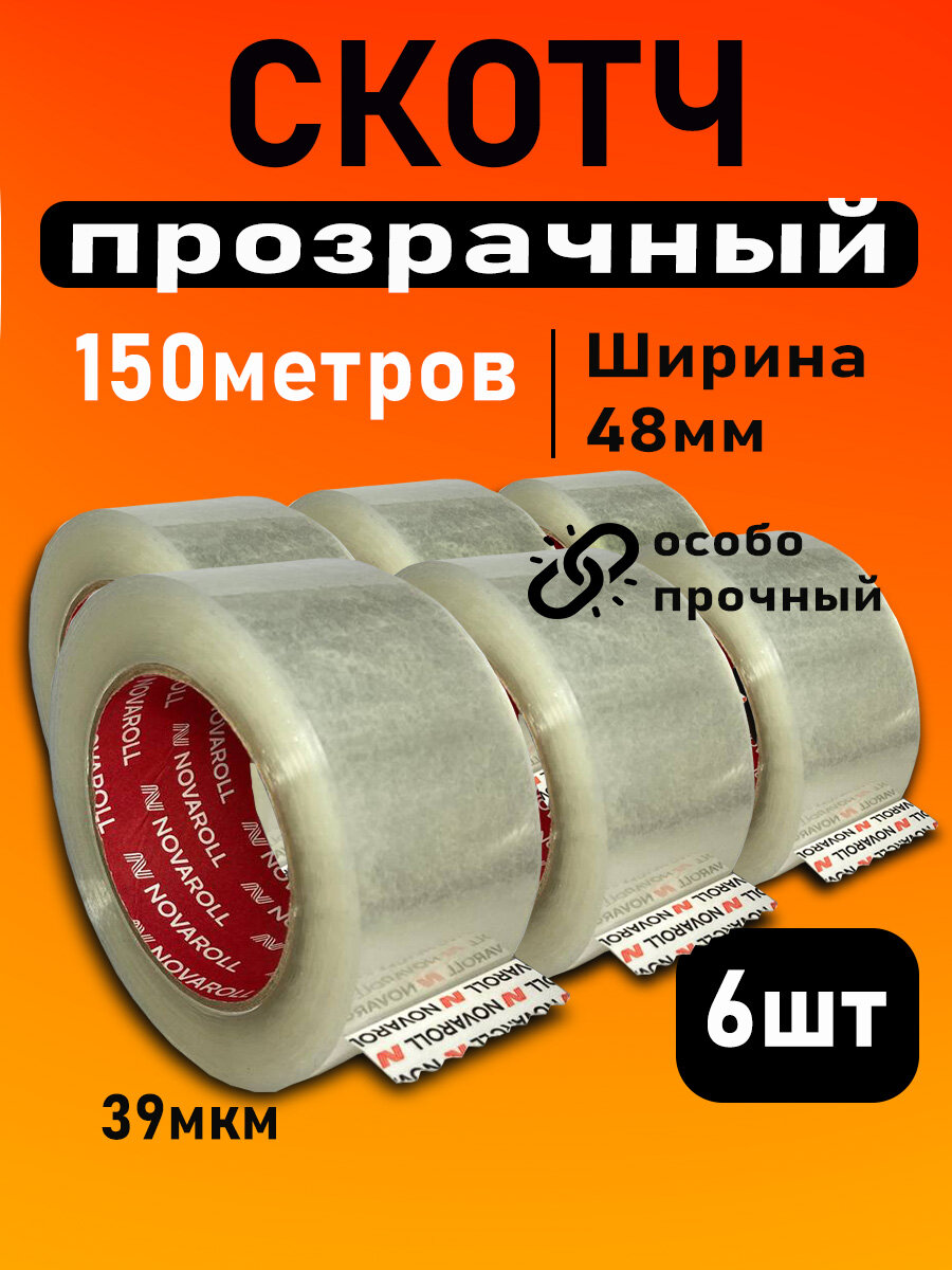 Клейкая лента упаковочная, 6 шт 150м х 48мм, 39мкм, скотч прозрачный, клейкая лента канцелярская интересное: