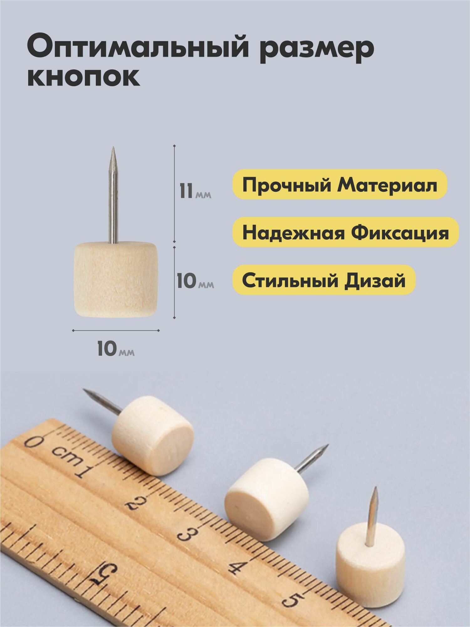 | Дополнительная информация | Набор кнопок-гвоздиков канцелярских, натуральное дерево, 50 шт в контейнере |