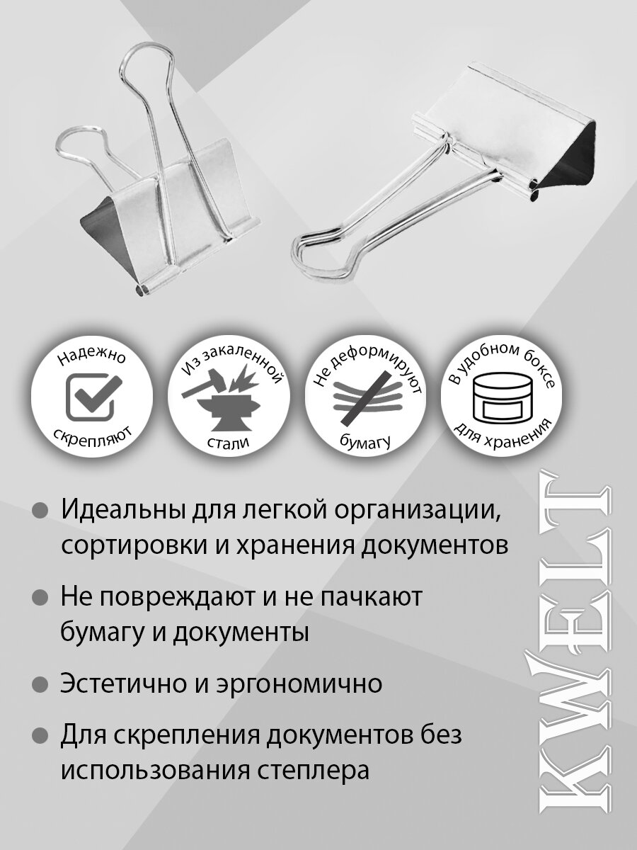 Зажимы канцелярские KWELT, металлические, 41 мм, цвет серебристый, 24 шт