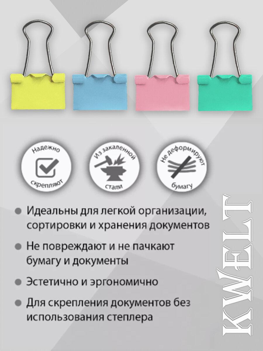 Зажимы " KWELT " цветные Macarons 41мм 24шт/уп, пластиковая упаковка