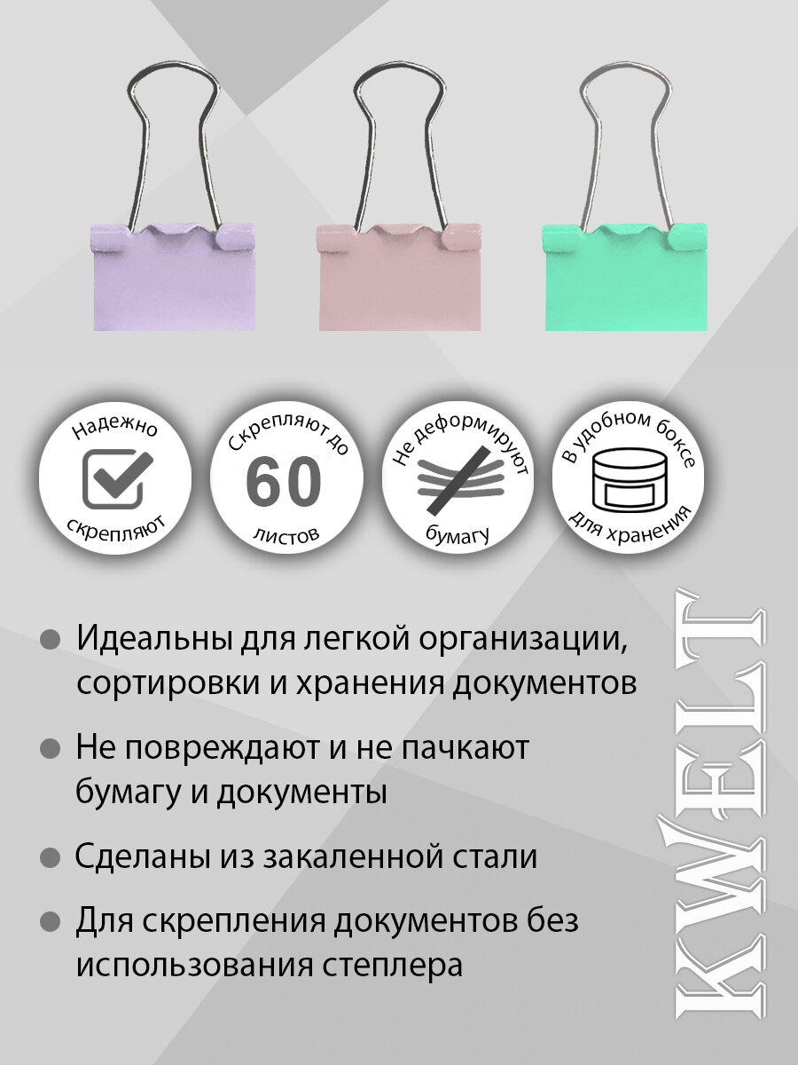 Зажимы " KWELT " цветные Macarons 15мм 60шт/уп, пластиковая упаковка