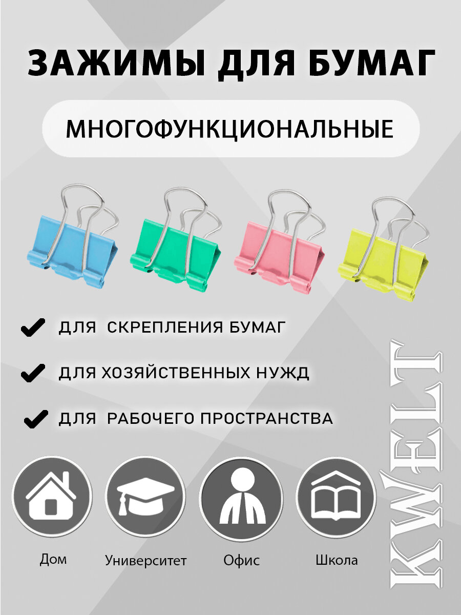 Зажимы канцелярские " KWELT " разноцветные 19мм 12шт/уп, картонная упаковка