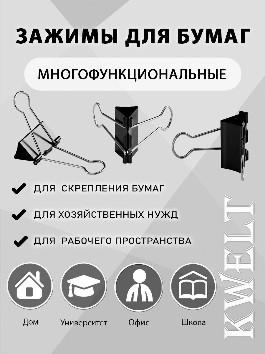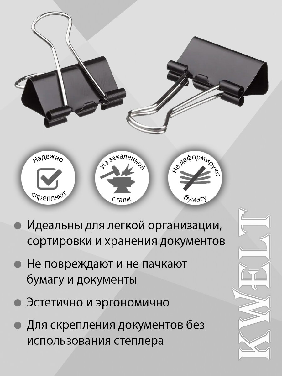 Купить Канцелярские зажимы KWELT, металл, закаленные, 19мм, 12шт, черные
