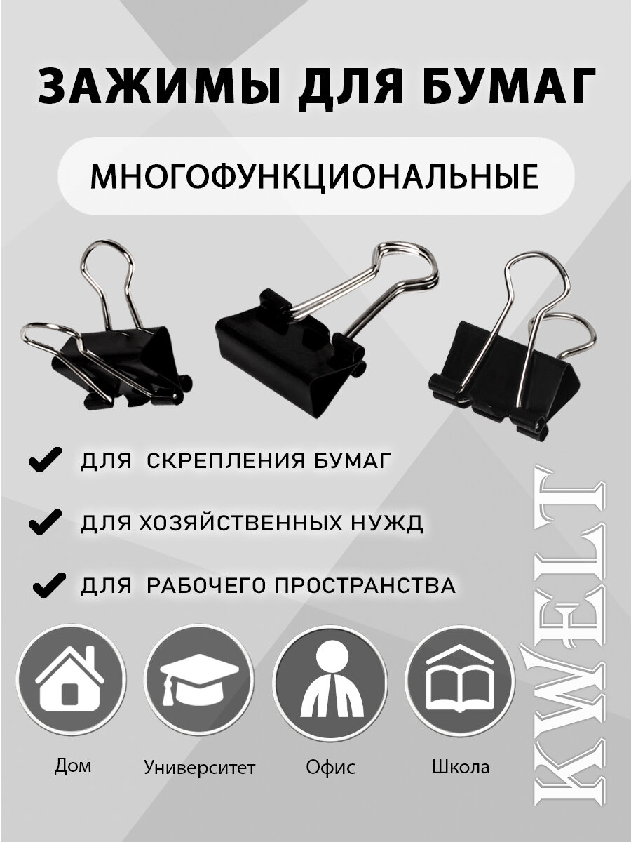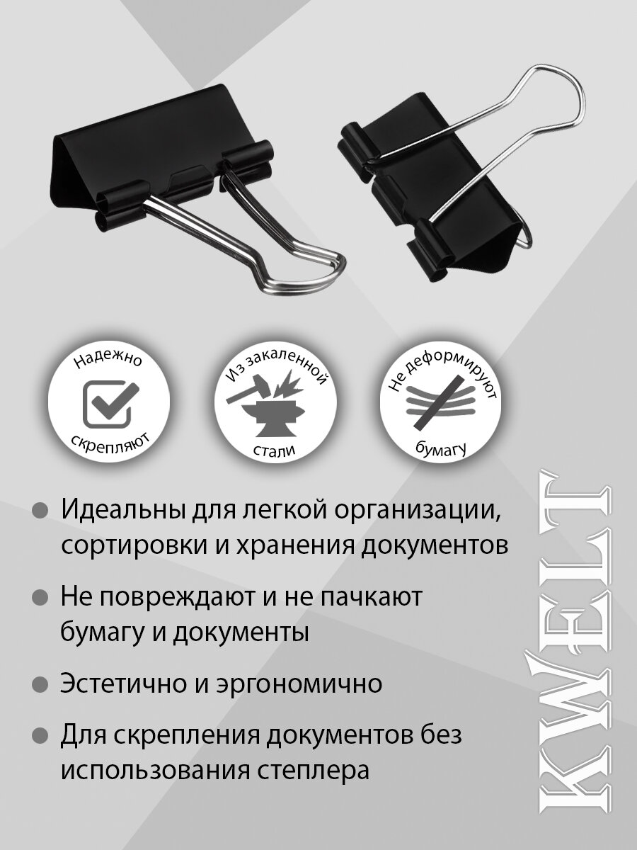 Канцелярские зажимы KWELT, металл, закаленные, 19мм, 12шт, черные