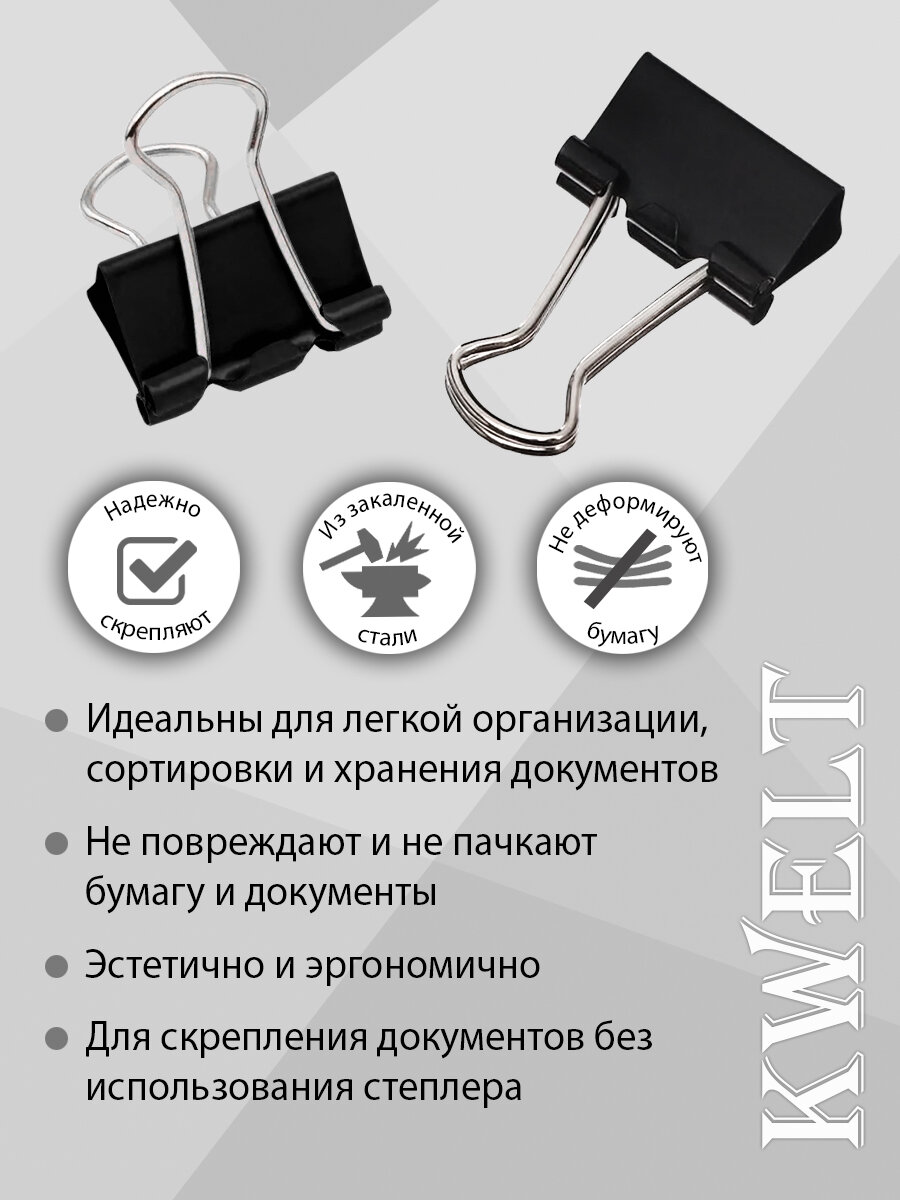 Канцелярские зажимы KWELT, металл, закаленные, 19мм, 12шт, черные