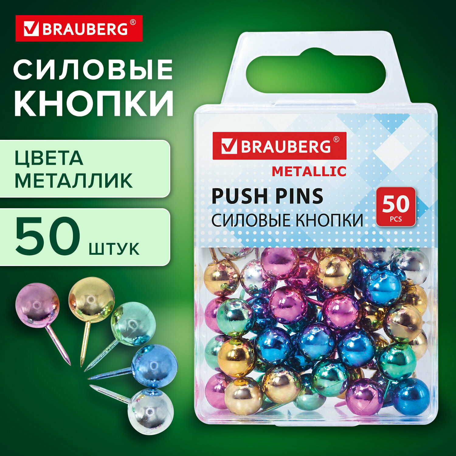 Силовые кнопки-гвоздики BRAUBERG METALLIC, цвет ассорти металлик (шарики), 50 штук, 10 мм, 272757 интересное: