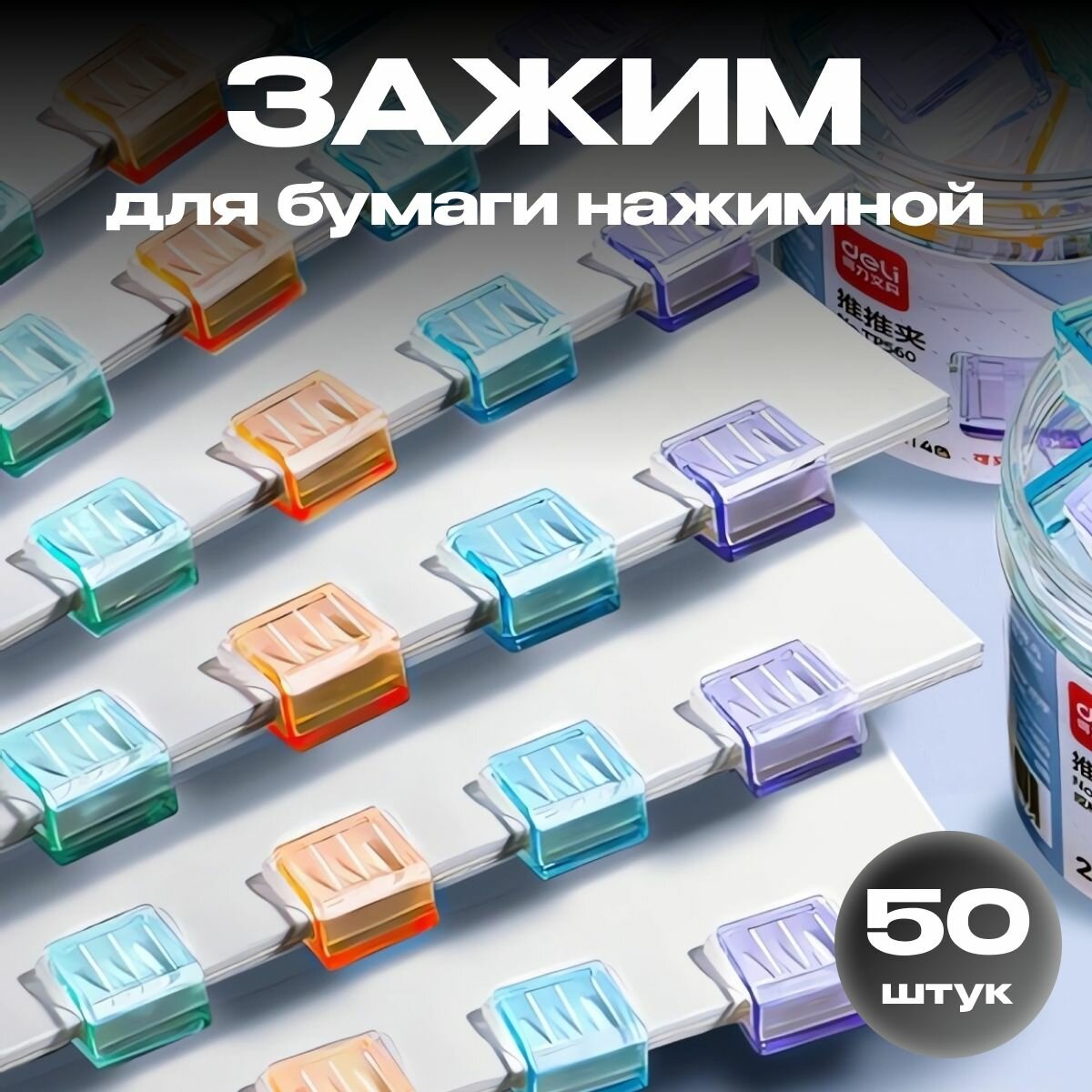 Зажим для бумаги пластиковый нажимной 50шт, скобы для бумаги разных цветов интересное: