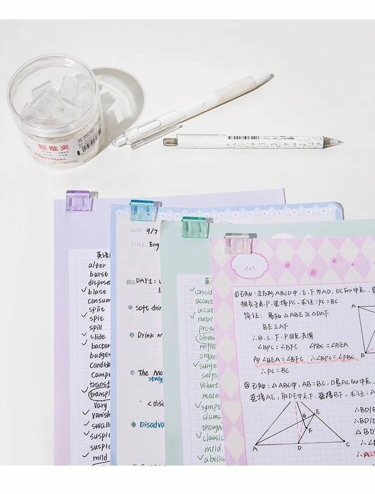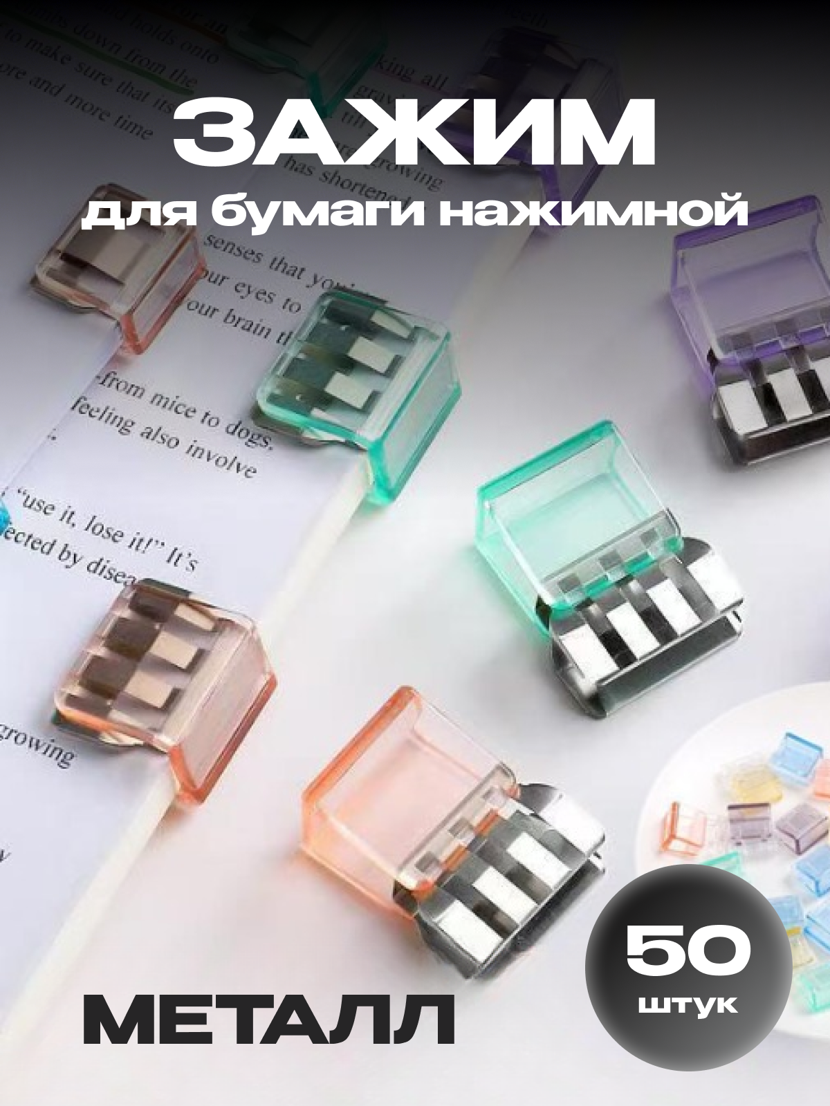 Зажим для бумаги пластиковый нажимной 50шт, скобы для бумаги разных цветов