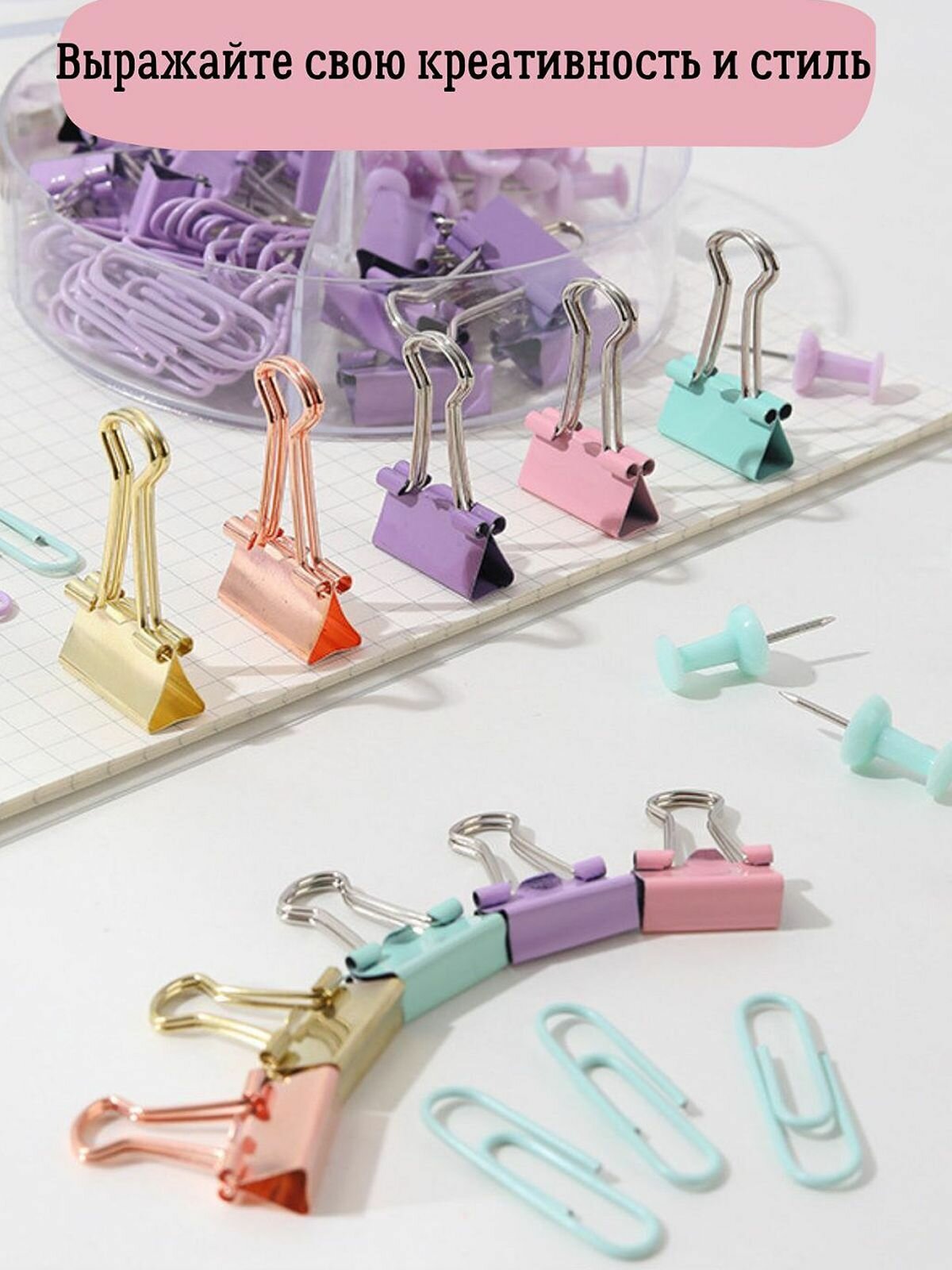 Набор канцелярский розовый из 4-х предметов - скрепки, зажимы 2 вида, кнопки (К0011-010) интересное: