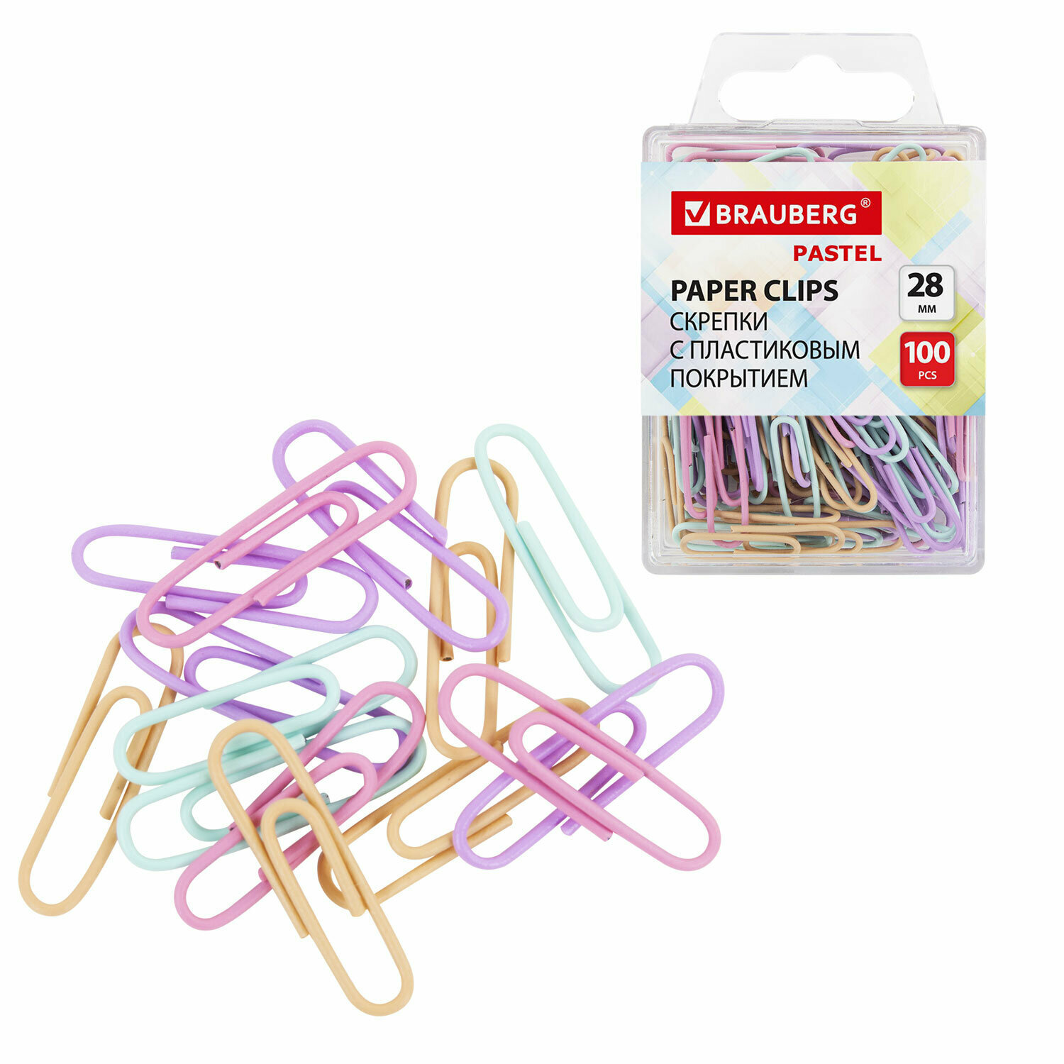 Купить Скрепки BRAUBERG PASTEL, 28 мм, пастельные цвета, 100 шт, в пластиковой коробке, 271956