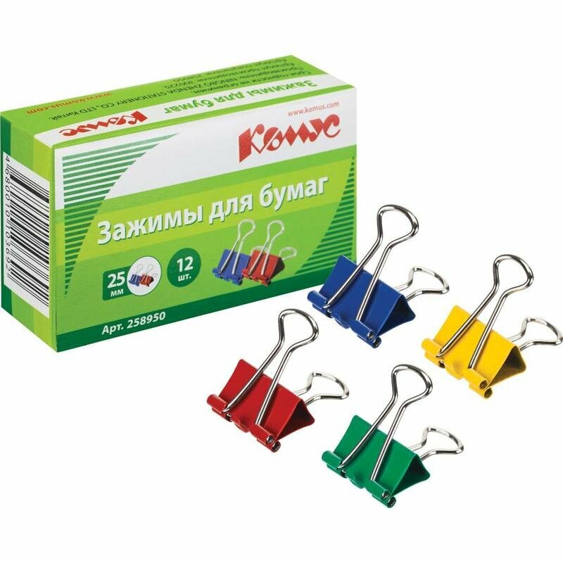 Зажимы для бумаг 25мм 12шт./уп. Комус цветные, картон интересное: