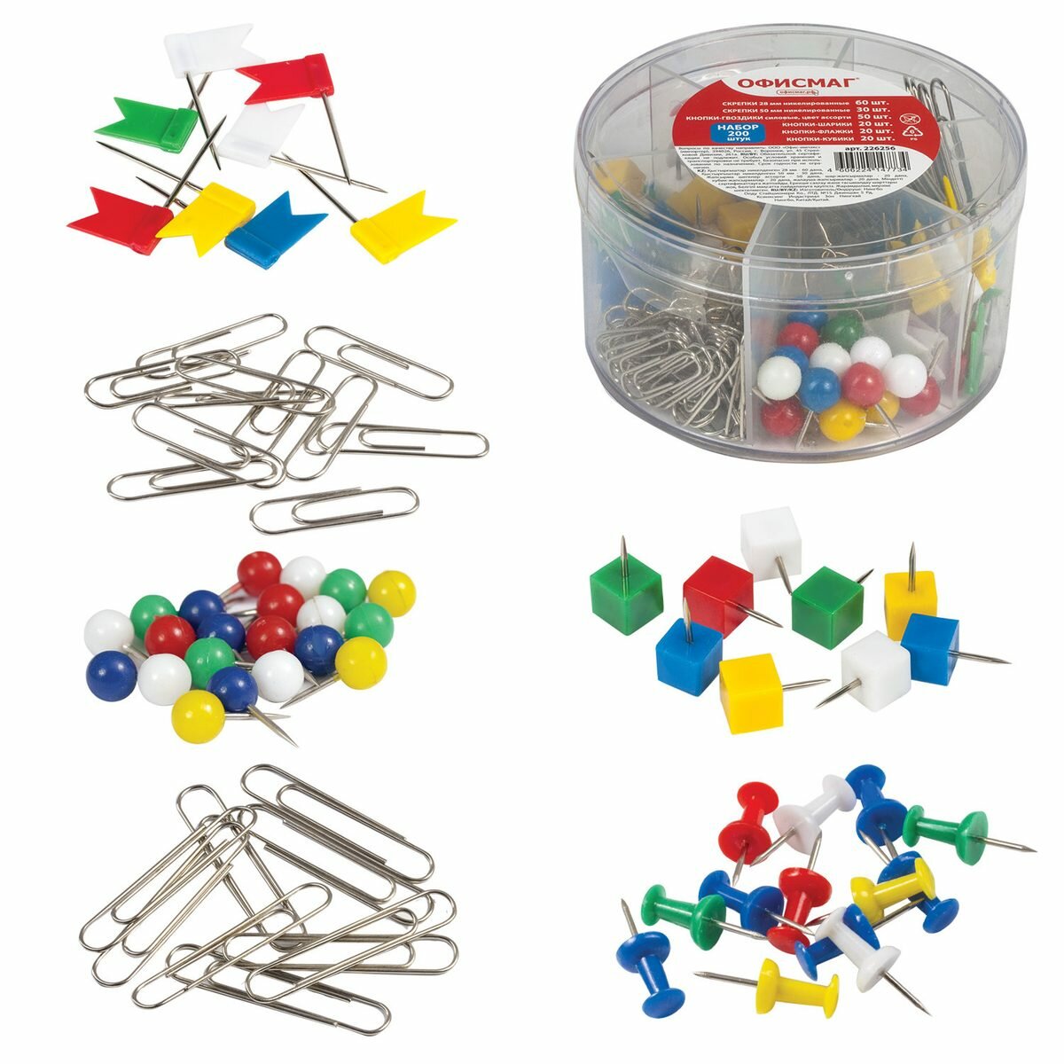 Набор канцелярский Офисмаг (скрепки 28мм и 50мм, гвоздики 50шт, шарики, кубики, флажки) (226256), 48 уп.