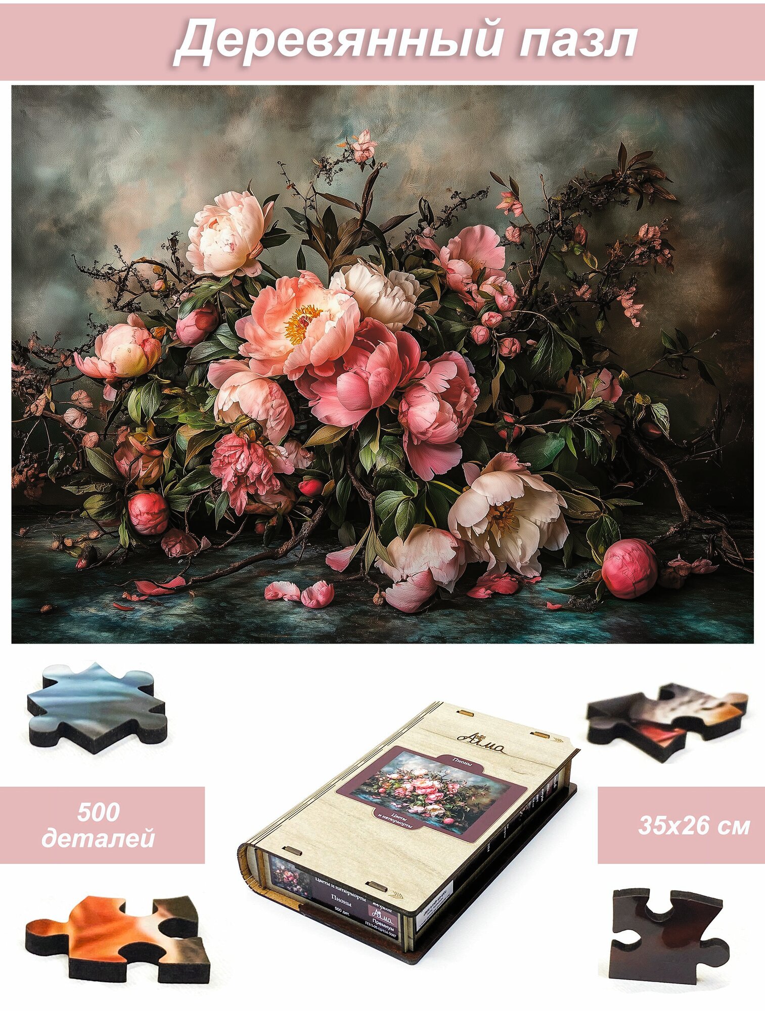 Купить Пазл деревянный для взрослых Алма 500 деталей: Цветы и натюрморты. Пионы