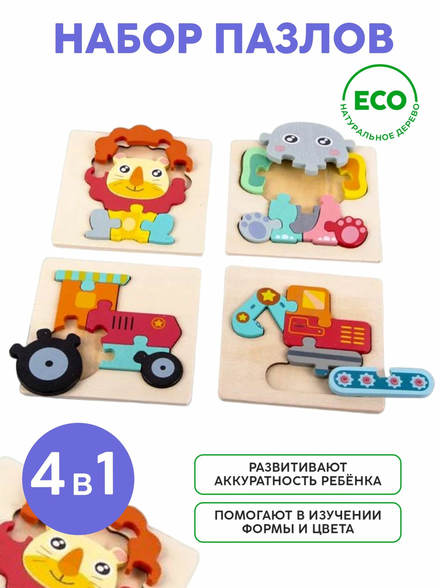Купить Набор из 4-х "Пазлов Ассорти: трактор, слон, экскаватор, лев"/развивающая настольная игра для детей