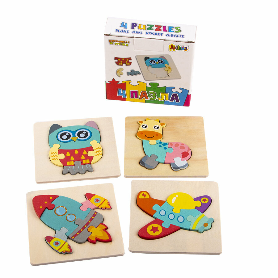 Купить Набор из 4-х деревянных Пазлов "Ассорти: самолет, сова, жираф, ракета"/развивающая настольная игра для детей