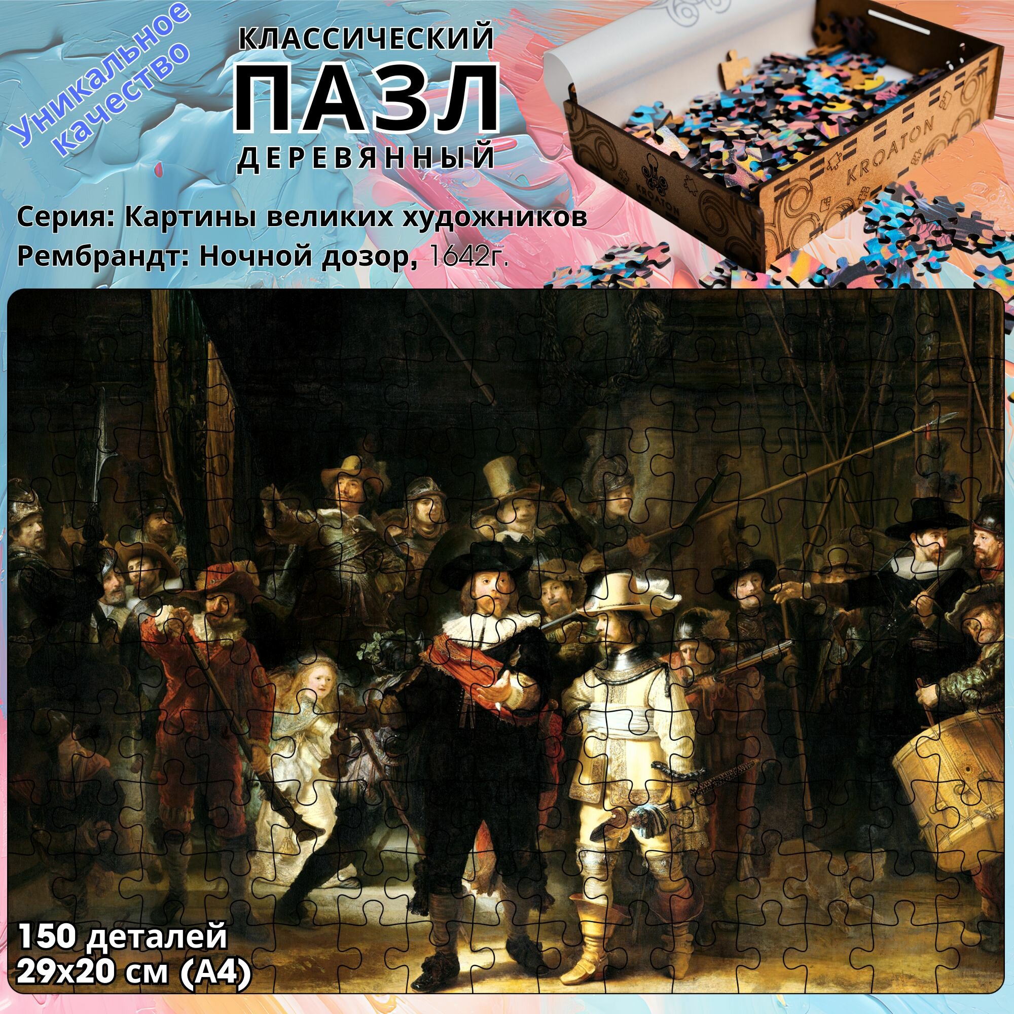 СохранитьДеревянный классический пазл Kroaton Рембрандт Ночной дозор 150 деталей 29*20 см интересное: