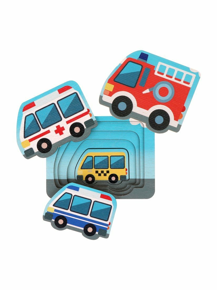 | Дополнительная информация | Пазл состоит из 4-х деталей, 4 слоев. Изображены: мусоровоз, такси, полицейская машина, машина скорой помощи и пожарная машина. |