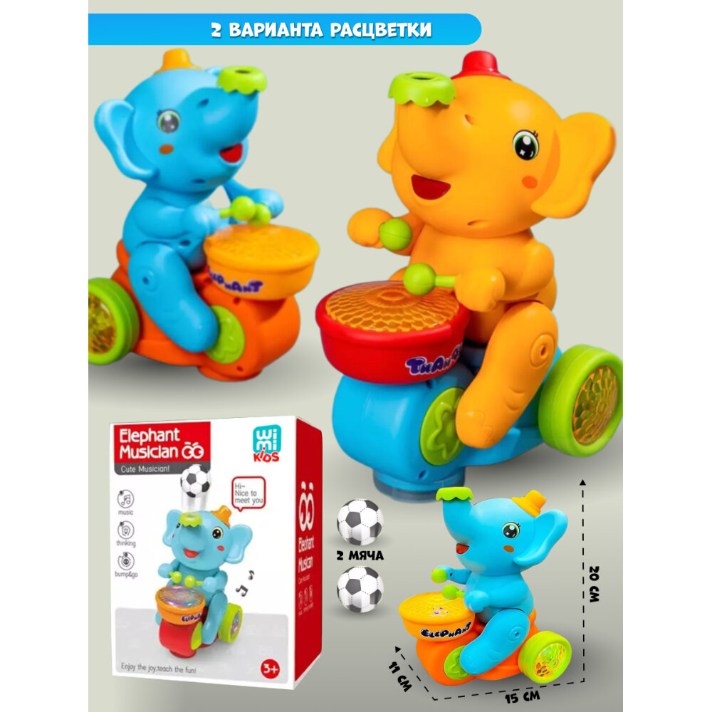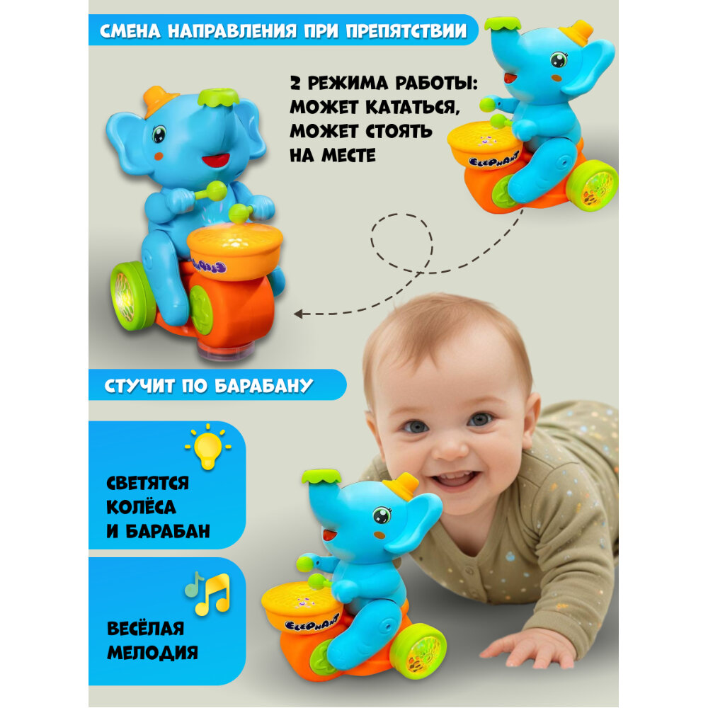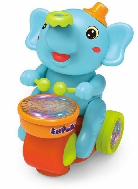 Музыкальная игрушка Веселый Слоненок с барабаном, на батарейках 20 х 15 х 11,5 см, едет, хоботом выдувает мяч, звуковые и световые эффекты интересное:
