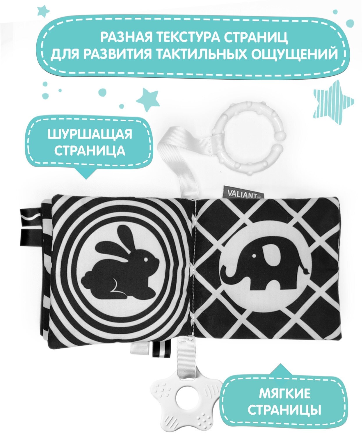 Книжка-игрушка VALIANT "Черный и Белый", с прорезывателем, для малышей 0+, 12x11 cм интересное: