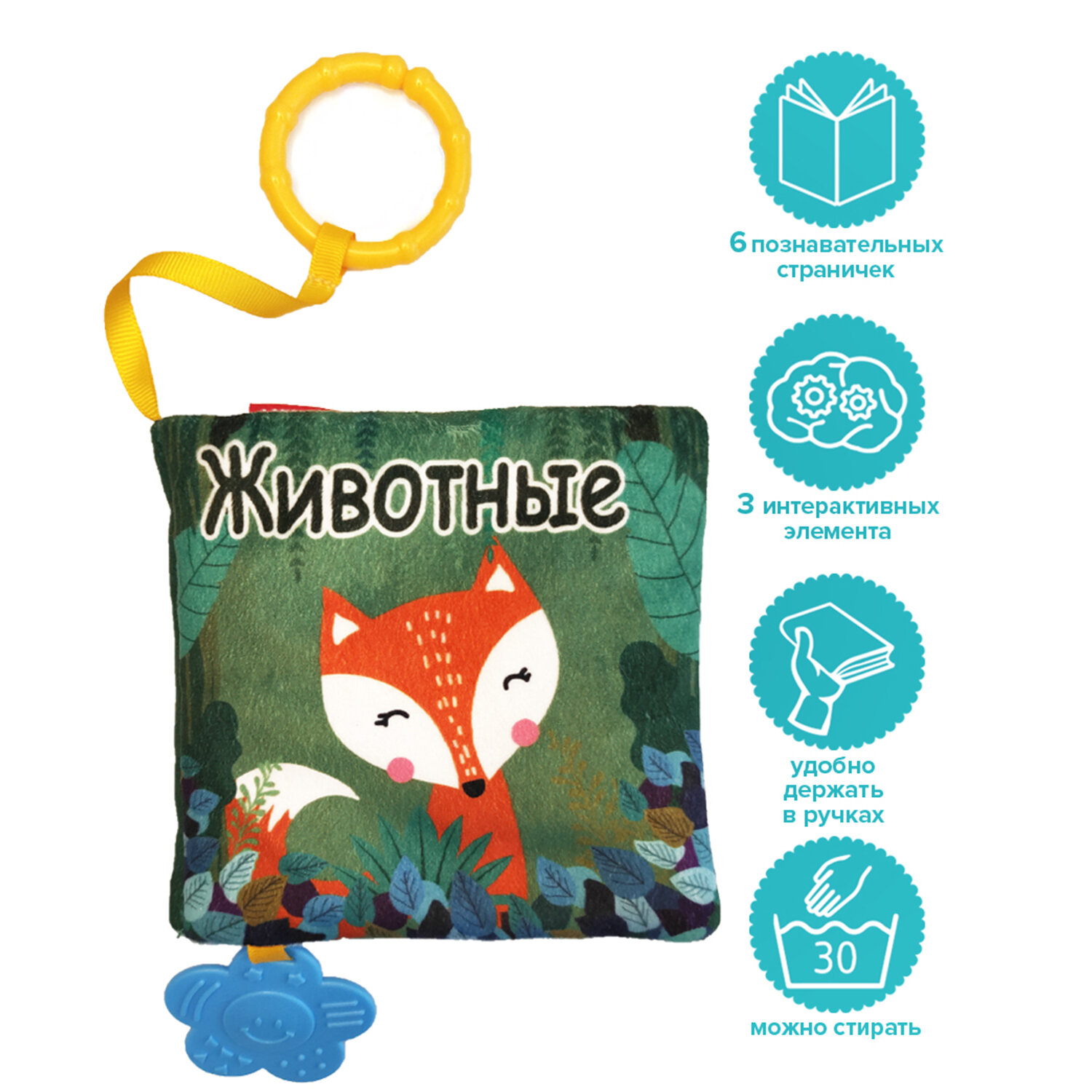 Книжка-игрушка животные, с прорезывателем и подвесом 13*13 см интересное: